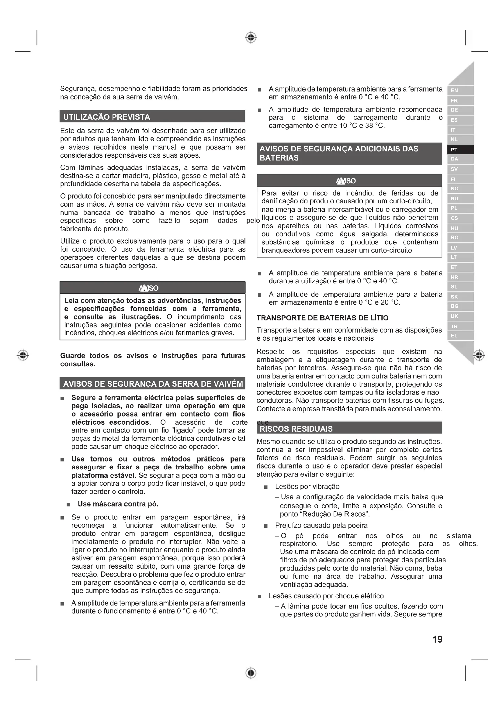Este da serra de vaivém foi desenhado para ser utilizado por adultos que tenham lido e compreendido as instruções e avisos recolhidos neste manual e que possam ser considerados responsáveis das suas ações. Com lâminas adequadas instaladas, a serra de vaivém destina-se a cortar madeira, plástico, gesso e metal até à SURIXQGLGDGHGHVFULWDQDWDEHODGHHVSHFL¿FDo}HV O produto foi concebido para ser manipulado directamente com as mãos. A serra de vaivém não deve ser montada numa bancada de trabalho a menos que instruções HVSHFt¿FDV VREUH FRPR ID]rOR VHMDP GDGDV SHOR fabricante do produto. Utilize o produto exclusivamente para o uso para o qual foi concebido. O uso da ferramenta eléctrica para as operações diferentes daquelas a que se destina podem causar uma situação perigosa. AVISO Leia com atenção todas as advertências, instruções e especificações fornecidas com a ferramenta, e consulte as ilustrações. O incumprimento das instruções seguintes pode ocasionar acidentes como LQFrQGLRVFKRTXHVHOpFWULFRVHRXIHULPHQWRVJUDYHV Guarde todos os avisos e instruções para futuras consultas. AVISOS DE SEGURANÇA DA SERRA DE VAIVÉM Ŷ Segure a ferramenta eléctrica pelas superfícies de pega isoladas, ao realizar uma operação em que o acessório possa entrar em contacto com fios eléctricos escondidos. 2 DFHVVyULR GH FRUWH TXH entre em contacto com um fio “ligado” pode tornar as peças de metal da ferramenta eléctrica condutivas e tal pode causar um choque eléctrico ao operador. Ŷ Use tornos ou outros métodos práticos para assegurar e fixar a peça de trabalho sobre uma plataforma estável. Se segurar a peça com a mão ou a apoiar contra o corpo pode ficar instável, o que pode fazer perder o controlo. Ŷ Use máscara contra pó. Ŷ Se o produto entrar em paragem espontânea, irá recomeçar a funcionar automaticamente. Se o produto entrar em paragem espontânea, desligue imediatamente o produto no interruptor. Não volte a ligar o produto no interruptor enquanto o produto ainda estiver em paragem espontânea, porque isso poderá causar um ressalto súbito, com uma grande força de reacção. Descubra o problema que fez o produto entrar em paragem espontânea e corrija-o, certificando-se de que cumpre todas as instruções de segurança. Ŷ A amplitude de temperatura ambiente para a ferramenta durante o funcionamento é entre 0 °C e 40 °C. Ŷ A amplitude de temperatura ambiente para a ferramenta em armazenamento é entre 0 °C e 40 °C. Ŷ A amplitude de temperatura ambiente recomendada para o sistema de carregamento durante o carregamento é entre 10 °C e 38 °C.