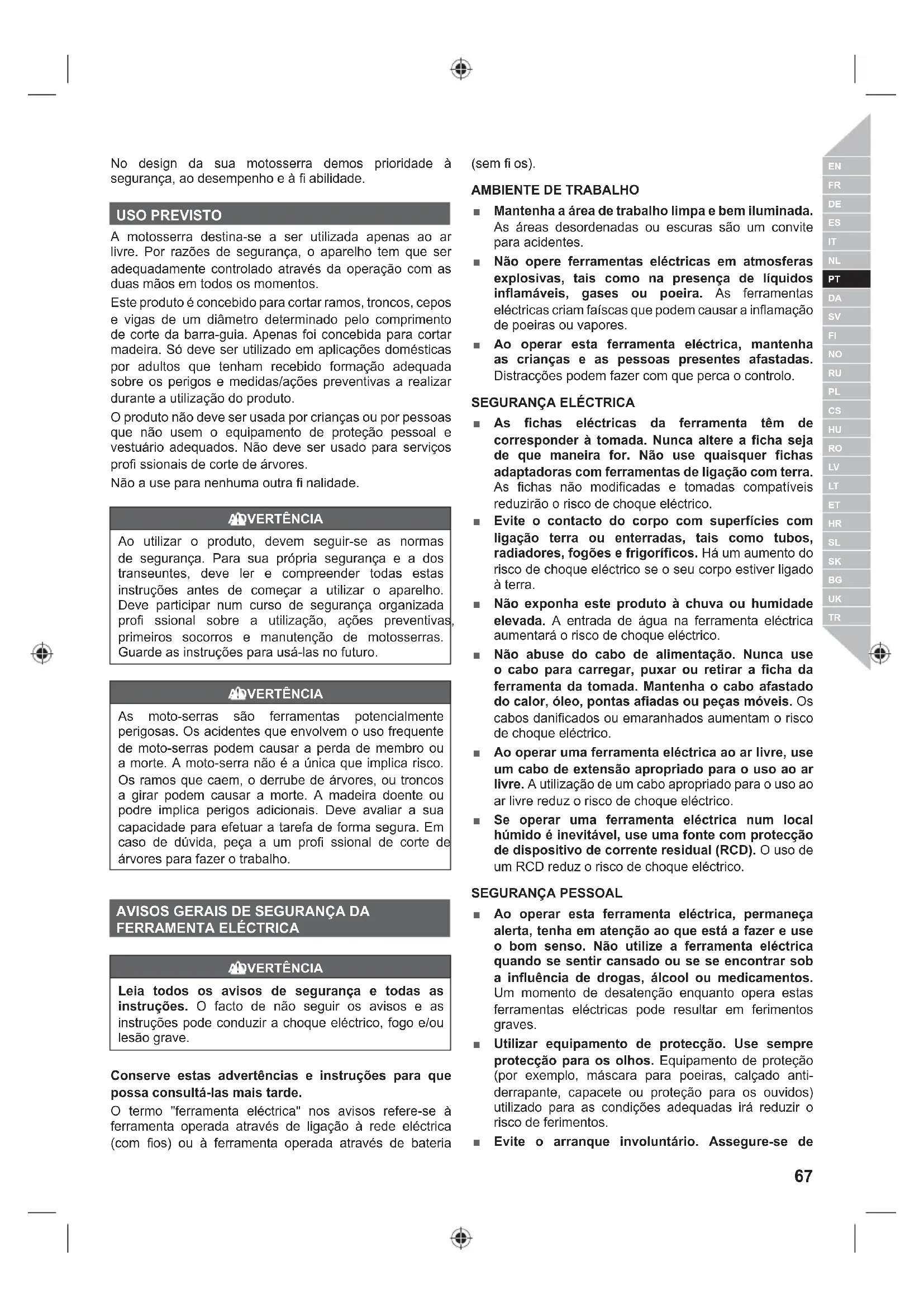■ Durante a utilização do produto, mantenha todas as partes do seu corpo afastadas da corrente da serra. Antes de iniciar a motosserra, certifique-se que a corrente da serra não se encontra em contacto com nada. Um momento de distração ao operar a motosserra pode causar emaranhamento da sua roupa ou corpo com a motosserra. ■ Segure sempre a motosserra com a sua mão direita na pega traseira e com a sua mão esquerda na pega dianteira. Segurar a motosserra com uma configuração da mão invertida aumenta o risco de lesão pessoal e deva nunca ser feito. ■ Agarre a ferramenta elétrica apenas pelas superfícies de preensão isoladas, porque a corrente da serra pode entrar em contacto com fios condutores ocultos ou com o próprio cabo. O contacto da motosserra com um cabo com tensão elétrica pode expor as peças metálicas da ferramenta à corrente elétrica, o que pode provocar um choque ao operador. ■ Use óculos de segurança proteção para os ouvidos. Recomenda-se ainda equipamento de proteção para a cabeça, mãos, pernas e pés é recomendado. A roupa de proteção adequada reduzirá o risco de lesões pessoais causadas por detritos esvoaçantes ou contacto acidental com a motosserra. ■ Não opere uma motosserra numa árvore. A utilização de uma motosserra enquanto se encontra em cima de uma árvore pode causar lesões pessoais. ■ Mantenha sempre o equilíbrio adequado dos pés e opere a motosserra apenas quando se encontra sobre uma superfície fixa, firme e nivelada. As superfícies escorregadiças ou instáveis tais como escadas podem causar uma perda de equilíbrio ou o controlo da motosserra. ■ Ao cortar um ramo que esteja sob tensão, esteja alerta para o efeito de ricochete. Quando a tensão nas fibras de madeira é libertada, o ramo catapultado pode atingir o operador e/ou atirar a motosserra e ficar fora de controlo. ■ Use extrema cautela ao cortar os arbustos e rebentos. O material delgado pode apanhar a motosserra e ser atirado para si ou tirar-lhe o equilíbrio. ■ Transporte a motosserra pela pega frontal com a motosserra desligada e afastada do seu corpo. Ao transportar ou armazenar a motosserra, coloque sempre a capa da barra guia. O segurar adequadamente na motosserra reduzirá a probabilidade de contacto acidental com a corrente móvel da serra. ■ Siga as instruções para a lubrificação, tensionamento da corrente e mudança dos acessórios. Uma corrente com a tensão ou a lubrificação incorretas também pode quebrar ou aumento o risco de ricochete. ■ Mantenha os manípulos secos, limpos e livres de óleo e graxa. As pegas gordurosas e oleosas são escorregadias, provocando a perda de controlo. ■ Corte apenas madeira. Não utilize a motosserra para fins a que não se destina. Por exemplo, não use a motosserra para cortar plástico, alvenaria ou materiais de construção que não sejam de madeira. O uso da motosserra para as operações diferentes daquelas a que se destina podem causar uma situação perigosa.70 | Português Causas e prevenção do utilizador do ricochete: Pode ocorrer um coice quando a ponta da barra-guia toca num objecto ou se a corrente da serra fi car entalada e bloquear-se na madeira durante o corte. O contacto com a ponta, em alguns casos, pode causar uma reação reversa rapidíssima, fazendo com que a barra guia salte para o operador. Apertar a corrente da serra ao longo do topo da barra guia pode fazer com que esta recue rapidamente na direcção do operador. Qualquer uma destas reacções pode fazer com que perca o controlo da serra e levar a graves ferimentos pessoais. Não dependa exclusivamente dos dispositivos de segurança incorporados na sua serra. Enquanto utilizador da serra, deverá tomar uma série de medidas tendentes a garantir que as operações de corte decorrem livres de acidentes ou ferimentos. O ricochete é o resultado de uma má utilização da ferramenta e/ou condições ou procedimentos de operação incorretos e pode ser evitado tomando as precauções apropriadas conforme indicado abaixo: ■ Segure firmemente, com os polegares e os dedos que cercam as pegas da motosserra, com ambas as mãos na serra e posicione o seu corpo e braço para permitir-lhe resistir à força do ricochete. As forças do ricochete podem ser controladas pelo operador, se as precauções apropriadas forem tomadas. Não largue a motosserra. ■ Não se estenda e não corte acima da altura do ombro. Isto ajuda a impedir o contacto da ponta não intencional e permite um melhor controlo da motosserra em situações inesperadas. ■ Utilize apenas correntes e barras sobressalentes do fabricante. As barras e as correntes de substituição incorretas podem causar uma rutura da corrente e/ou ricochete. ■ Siga as instruções de afiação e manutenção do fabricante da corrente da serra. Diminuir a altura do calibre da profundidade pode conduzir a aumentos do ricochete. ADVERTÊNCIAS ADICIONAIS DE SEGURANÇA DA MOTO-SERRA ■ É recomendável cortar os troncos num cavalete de serrador ou num suporte ao operar o aparelho pela primeira vez. ■ Certifique-se de todas as proteções, pegas e para- choques dentado estão devidamente instalados e em boas condições. ■ As pessoas que utilizarem o produto devem estar em bom estado de saúde. O produto é pesado, portanto o utilizador tem obrigatoriamente de estar em boa forma física. O operador deve estar alerta, ter boa visão, mobilidade, equilíbrio e destreza manual. Se tiver alguma dúvida, não utilize o produto. ■ Não comece a usar o produto até que tenha uma área de trabalho clara, base segura e um caminho de retirada planeada afastado da queda da árvore. ■ Cuidado com a emissão da névoa de lubrificante e serrim. Utilize uma máscara ou respirador, se necessário. ■ Se o cabo de alimentação sofrer danos, repare o seu produto exclusivamente num centro de assistência autorizado. ■ Mantenha sempre o cabo de alimentação arrumado e afastado da 