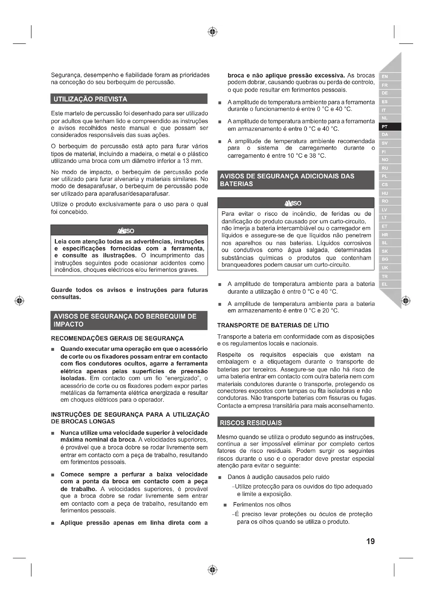 Este martelo de percussão foi desenhado para ser utilizado por adultos que tenham lido e compreendido as instruções e avisos recolhidos neste manual e que possam ser considerados responsáveis das suas ações. O berbequim de percussão está apto para furar vários tipos de material, incluindo a madeira, o metal e o plástico utilizando uma broca com um diâmetro inferior a 13 mm. No modo de impacto, o berbequim de percussão pode ser utilizado para furar alvenaria y materiais similares. No modo de desaparafusar, o berbequim de percussão pode VHUXWLOL]DGRSDUDDSDUDIXVDUGHVDSDUDIXVDU Utilize o produto exclusivamente para o uso para o qual foi concebido. AVISO Leia com atenção todas as advertências, instruções e especificações fornecidas com a ferramenta, e consulte as ilustrações. O incumprimento das instruções seguintes pode ocasionar acidentes como LQFrQGLRVFKRTXHVHOpFWULFRVHRXIHULPHQWRVJUDYHV Guarde todos os avisos e instruções para futuras consultas. AVISOS DE SEGURANÇA DO BERBEQUIM DE IMPACTO