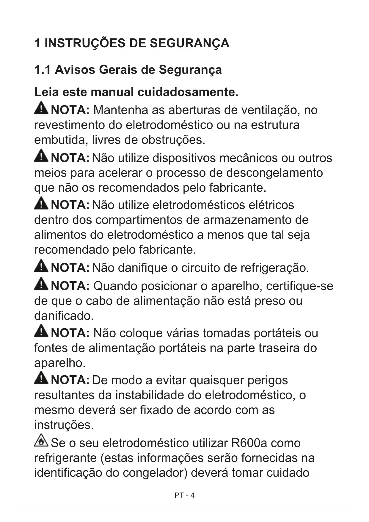 1.1 Avisos Gerais de Segurança Leia este manual cuidadosamente. NOTA: Mantenha as aberturas de ventilação, no revestimento do eletrodoméstico ou na estrutura embutida, livres de obstruções. NOTA: Não utilize dispositivos mecânicos ou outros meios para acelerar o processo de descongelamento que não os recomendados pelo fabricante. NOTA: Não utilize eletrodomésticos elétricos dentro dos compartimentos de armazenamento de alimentos do eletrodoméstico a menos que tal seja recomendado pelo fabricante. NOTA: Não danique o circuito de refrigeração. NOTA: Quando posicionar o aparelho, certique-se de que o cabo de alimentação não está preso ou danicado. NOTA: Não coloque várias tomadas portáteis ou fontes de alimentação portáteis na parte traseira do aparelho. NOTA: De modo a evitar quaisquer perigos resultantes da instabilidade do eletrodoméstico, o mesmo deverá ser xado de acordo com as instruções. Se o seu eletrodoméstico utilizar R600a como refrigerante (estas informações serão fornecidas na identicação do congelador) deverá tomar cuidadoPT - 5 durante o transportee instalação para evitar que elementos do congelador quem danicados. O R600a é amigo do ambiente e um gás natural, no entanto, explosivo. Na eventualidade de uma fuga devido a danos dos elementos do congelador, afaste o seu frigoríco de chamas vivas ou fontes de calor e ventile, durante alguns minutos, a divisão onde se localiza o frigoríco.