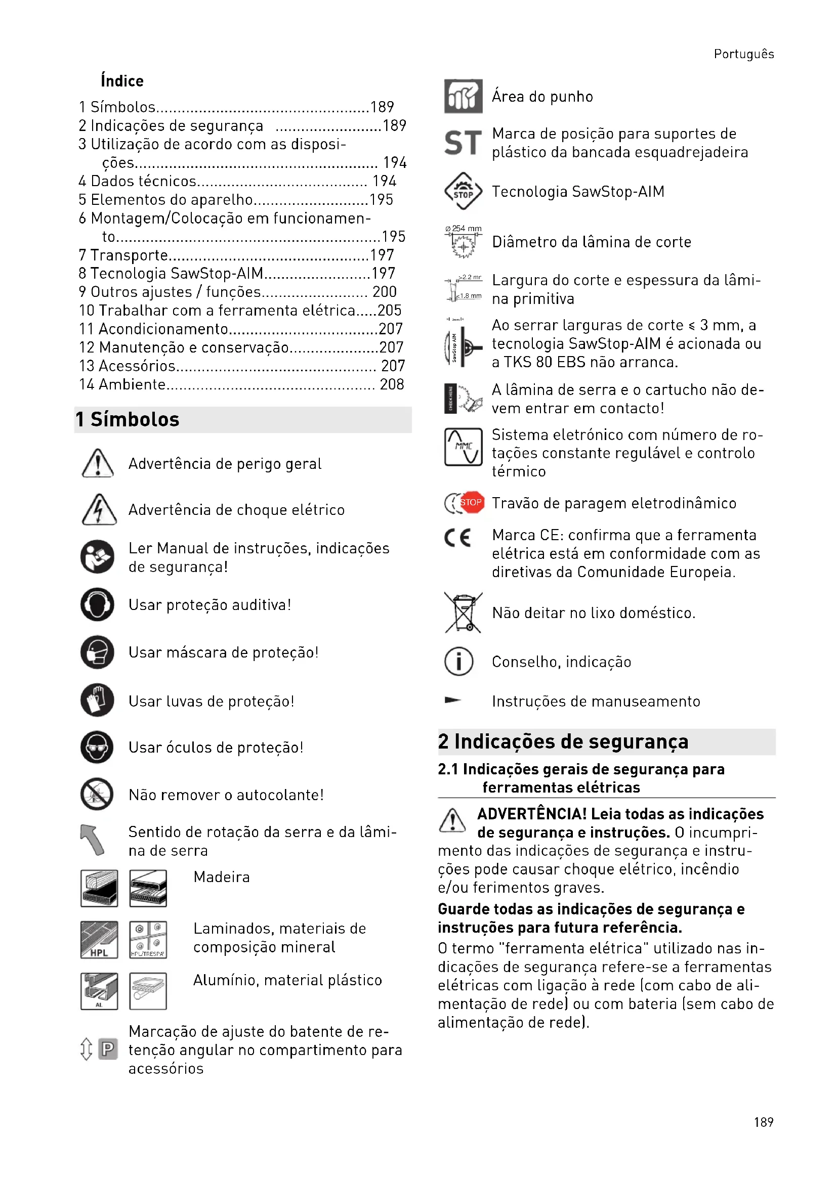 - 14 Ambiente 1 Símbolos Advertência de perigo geral Advertência de choque elétrico Ler Manual de instruções, indicações de segurança! Usar proteção auditiva! Usar máscara de proteção! Usar luvas de proteção! Usar óculos de proteção! Não remover o autocolante! Sentido de rotação da serra e da lâmi na de serra Madeira HPL/TRESPA p. 208