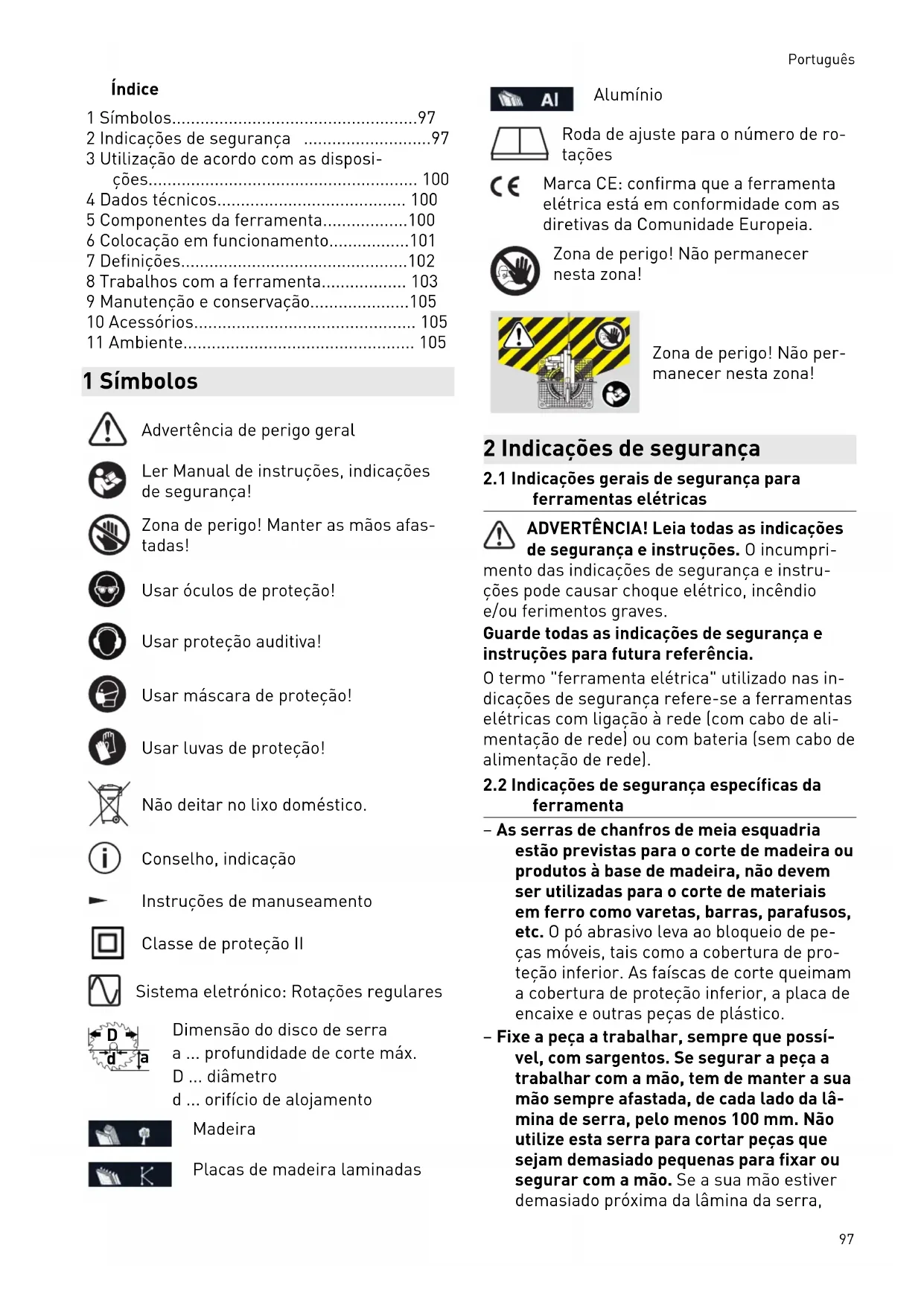 Dimensão do disco de serra a ... profundidade de corte máx. D ... diâmetro d ... orifício de alojamento Madeira Placas de madeira laminadas Alumínio Roda de ajuste para o número de ro tações Marca CE: confirma que a ferramenta elétrica está em conformidade com as diretivas da Comunidade Europeia. Zona de perigo! Não permanecer nesta zona! Zona de perigo! Não per manecer nesta zona! 2 Indicações de segurança