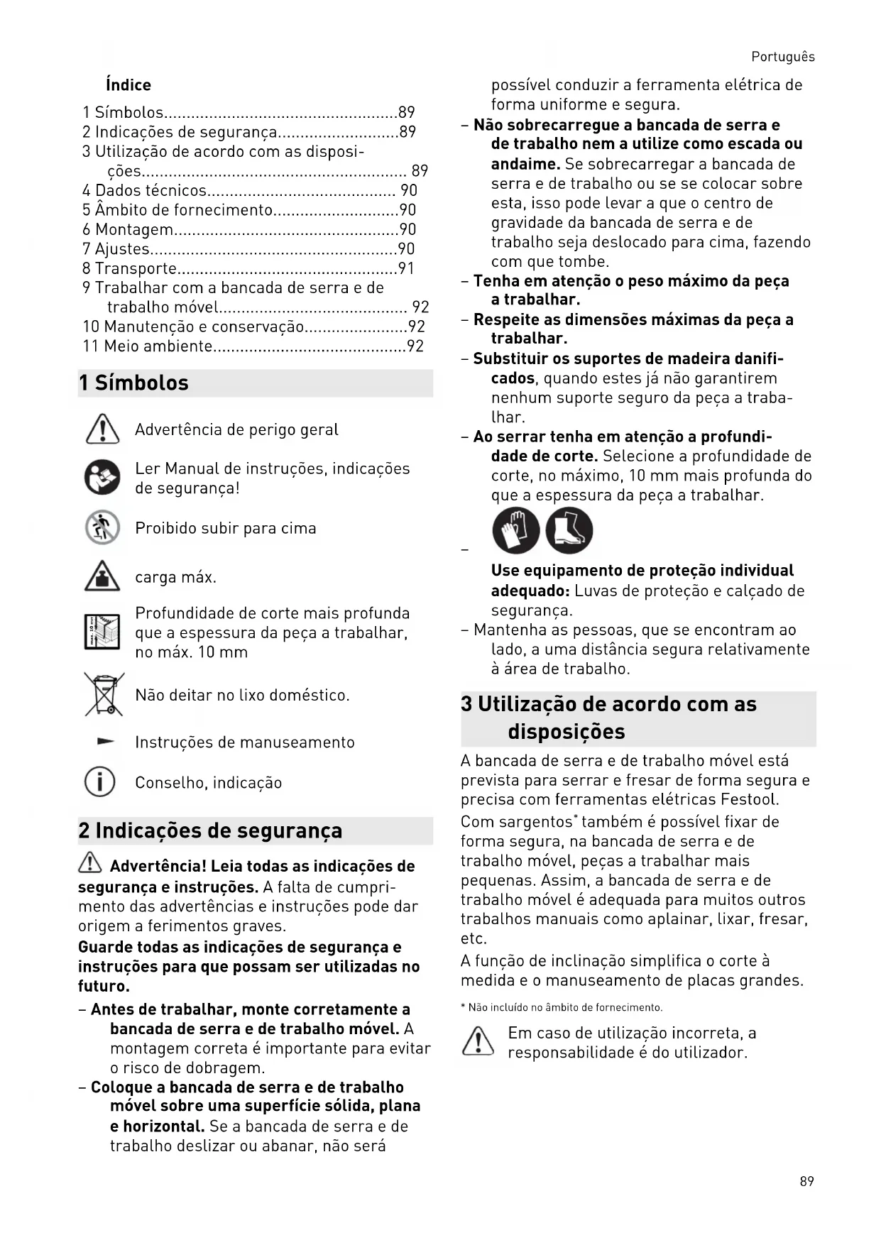 - 11 Meio ambiente 1 Símbolos Advertência de perigo geral Ler Manual de instruções, indicações de segurança! Proibido subir para cima carga máx. max. 10 mm Profundidade de corte mais profunda que a espessura da peça a trabalhar, no máx. 10 mm Não deitar no lixo doméstico. Instruções de manuseamento Conselho, indicação 2 Indicações de segurança Advertência! Leia todas as indicações de segurança e instruções. A falta de cumpri mento das advertências e instruções pode dar origem a ferimentos graves. Guarde todas as indicações de segurança e instruções para que possam ser utilizadas no futuro. – Antes de trabalhar, monte corretamente a bancada de serra e de trabalho móvel. A montagem correta é importante para evitar o risco de dobragem. – Coloque a bancada de serra e de trabalho móvel sobre uma superfície sólida, plana e horizontal. Se a bancada de serra e de trabalho deslizar ou abanar, não será possível conduzir a ferramenta elétrica de forma uniforme e segura. – Não sobrecarregue a bancada de serra e de trabalho nem a utilize como escada ou andaime. Se sobrecarregar a bancada de serra e de trabalho ou se se colocar sobre esta, isso pode levar a que o centro de gravidade da bancada de serra e de trabalho seja deslocado para cima, fazendo com que tombe. – Tenha em atenção o peso máximo da peça a trabalhar. – Respeite as dimensões máximas da peça a trabalhar. – Substituir os suportes de madeira danifi cados, quando estes já não garantirem nenhum suporte seguro da peça a traba lhar. – Ao serrar tenha em atenção a profundi dade de corte. Selecione a profundidade de corte, no máximo, 10 mm mais profunda do que a espessura da peça a trabalhar. p. 92