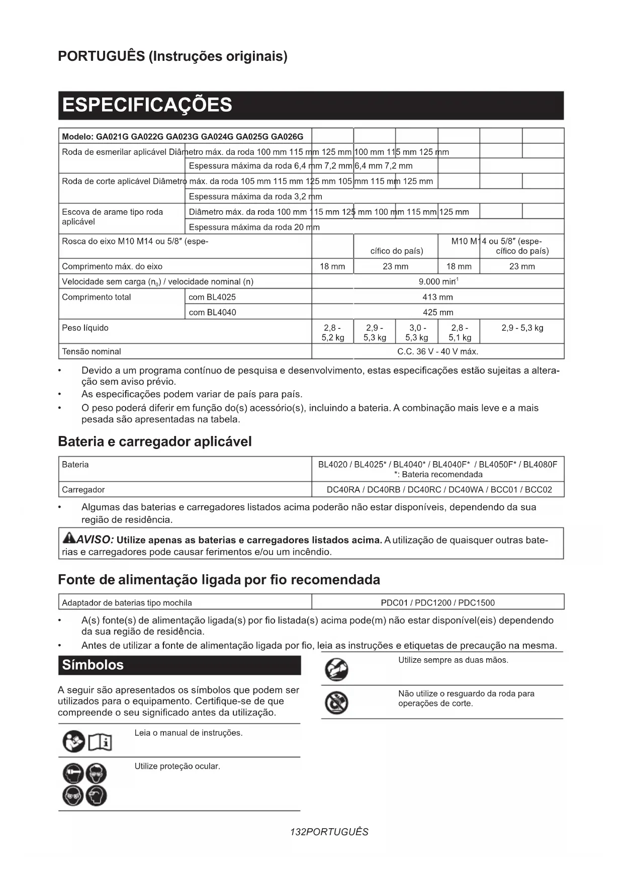 : (dB (A)) Incerteza (K): (dB (A)) GA021G 84 92 3 GA022G 84 92 3 GA023G 84 92 3 GA024G 84 92 3 GA025G 84 92 3 GA026G 84 92 3 NOTA: O(s) valor(es) da emissão de ruído indicado(s) foi medido de acordo com um método de teste padrão e pode ser utilizado para comparar duas ferramentas. NOTA: O(s) valor(es) da emissão de ruído indicado(s) pode também ser utilizado na avaliação preliminar da exposição. AVISO: Utilize protetores auriculares. AVISO: A emissão de ruído durante a utilização real da ferramenta elétrica pode diferir do(s) valor(es) indicado(s), dependendo das formas como a ferramenta é utilizada, especialmente o tipo de peça de tra- balho que é processada. AVISO: Certique-se de identicar as medidas de segurança para proteção do operador que sejam baseadas em uma estimativa de exposição em condições reais de utilização (considerando todas as partes do ciclo de operação, tal como quando a ferramenta está desligada e quando está a funcionar em marcha lenta além do tempo de acionamento). AVISO: Esmerilar folhas de metal nas ou outras estruturas que vibram facilmente com uma grande superfície pode resultar numa emissão de ruído total muito mais alta (até 15 dB) do que os valores de emissões de ruído declarados. Instale tapetes amortecedores exíveis pesados ou similares nas peças de trabalho para evitar que estas emitam ruído. Tenha em consideração o aumento das emissões de ruído tanto para a avaliação de risco de exposição ao ruído como para selecionar a proteção auditiva adequada. Vibração Valor total da vibração (soma vetorial tri-axial) determinado de acordo com a EN62841-2-3: Modo de trabalho: esmerilagem de superfície com punho lateral normal134 PORTUGUÊS Modelo Emissão de vibração (a