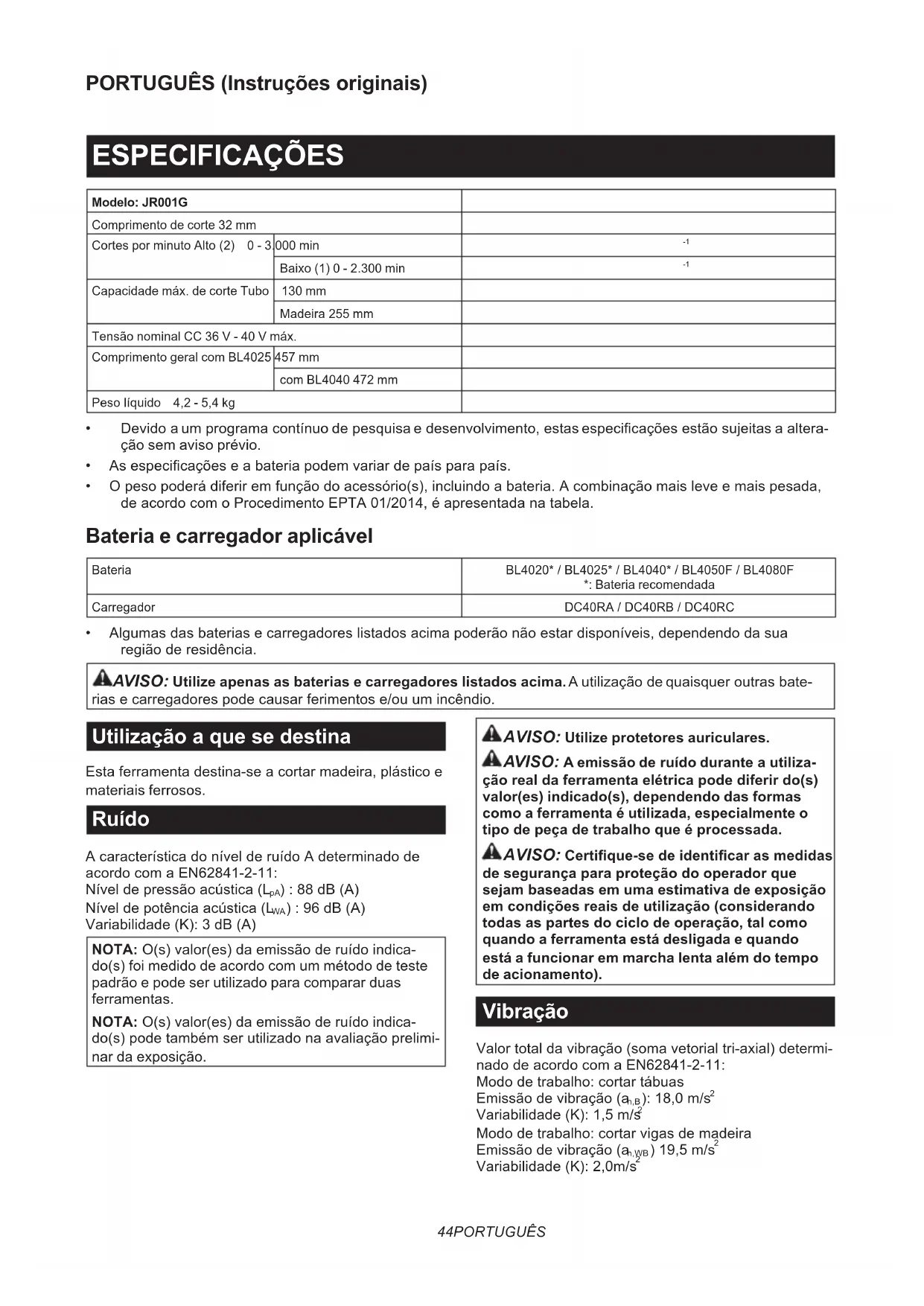 - Algumasdasbateriasecarregadoreslistadosacimapoderãonãoestardisponíveis,dependendodasua regiãoderesidência. AVISO: Utilize apenas as baterias e carregadores listados acima.Autilizaçãodequaisqueroutrasbate- riasecarregadorespodecausarferimentose/ouumincêndio. Utilização a que se destina Estaferramentadestina-seacortarmadeira,plásticoe materiais ferrosos. Ruído AcaracterísticadonívelderuídoAdeterminadode acordocomaEN62841-2-11: Níveldepressãoacústica(L