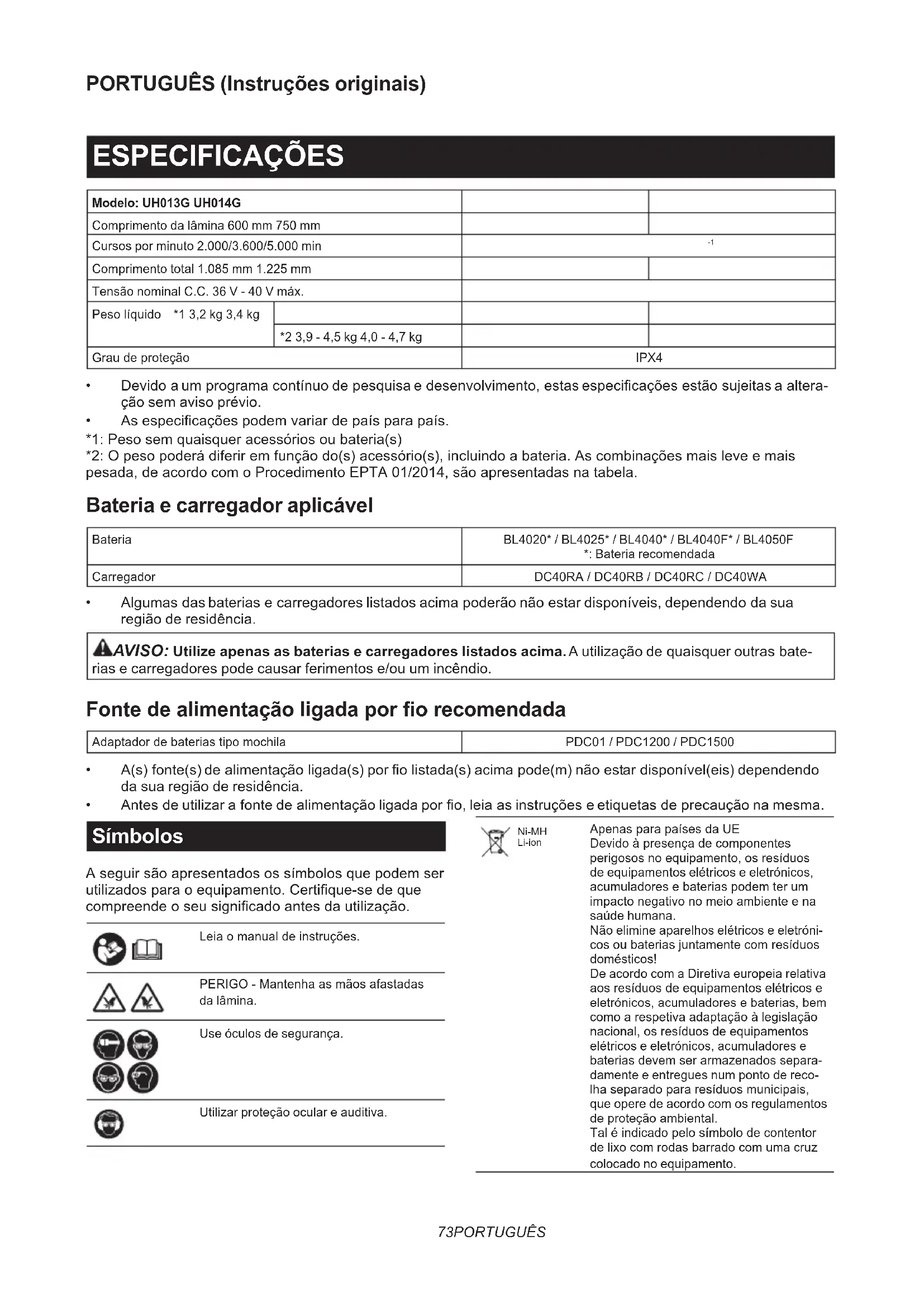 - Antesdeutilizarafontedealimentaçãoligadaporo,leiaasinstruçõeseetiquetasdeprecauçãonamesma. Símbolos Aseguirsãoapresentadosossímbolosquepodemser utilizadosparaoequipamento.Certique-sedeque compreendeoseusignicadoantesdautilização. Leiaomanualdeinstruções. PERIGO-Mantenhaasmãosafastadas da lâmina. Use óculos de segurança. Utilizar proteção ocular e auditiva. Ni-MH Li-ion ApenasparapaísesdaUE Devidoàpresençadecomponentes perigososnoequipamento,osresíduos de equipamentos elétricos e eletrónicos, acumuladoresebateriaspodemterum impactonegativonomeioambienteena saúde humana. Não elimine aparelhos elétricos e eletróni- cosoubateriasjuntamentecomresíduos domésticos! De acordo com a Diretiva europeia relativa aosresíduosdeequipamentoselétricose eletrónicos,acumuladoresebaterias,bem comoarespetivaadaptaçãoàlegislação nacional,osresíduosdeequipamentos elétricos e eletrónicos, acumuladores e bateriasdevemserarmazenadossepara- damente e entregues num ponto de reco- lhaseparadopararesíduosmunicipais, que opere de acordo com os regulamentos deproteçãoambiental. Taléindicadopelosímbolodecontentor delixocomrodasbarradocomumacruz colocado no equipamento.74 PORTUGUÊS Utilização a que se destina Aferramentadestina-seaapararsebes. Ruído AcaracterísticadonívelderuídoAdeterminadodeacordocomaEN62841-4-2: Modelo Nível de pressão sonora Nível garantido de potên- cia sonora Nível medido de potên- cia sonora