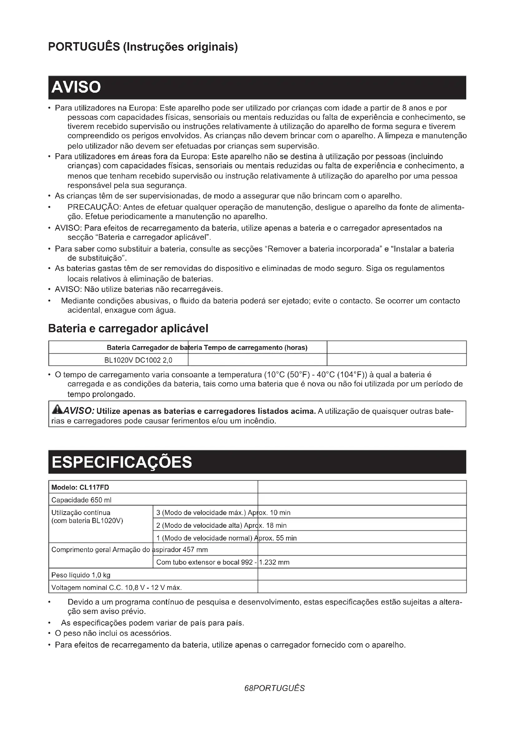 - O tempo de carregamento varia consoante a temperatura (10°C (50°F) - 40°C (104°F)) à qual a bateria é carregada e as condições da bateria, tais como uma bateria que é nova ou não foi utilizada por um período de tempo prolongado. AVISO: Utilize apenas as baterias e carregadores listados acima. A utilização de quaisquer outras bate- riasecarregadorespodecausarferimentose/ouumincêndio. ESPECIFICAÇÕES Modelo: CL117FD Capacidade 650 ml Utilização contínua (com bateria BL1020V) 3 (Modo de velocidade máx.) Aprox. 10 min 2 (Modo de velocidade alta) Aprox. 18 min 1 (Modo de velocidade normal) Aprox. 55 min Comprimento geral Armação do aspirador 457 mm Com tubo extensor e bocal 992 - 1.232 mm Peso líquido 1,0 kg Voltagem nominal C.C. 10,8 V - 12 V máx.