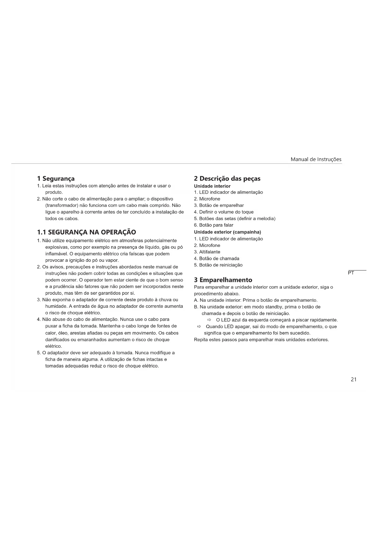 3 Emparelhamento Para emparelhar a unidade interior com a unidade exterior, siga o procedimento abaixo. A. Na unidade interior: Prima o botão de emparelhamento. B. Na unidade exterior: em modo standby, prima o botão de chamada e depois o botão de reiniciação. ð O LED azul da esquerda começará a piscar rapidamente. ð Quando LED apagar, sai do modo de emparelhamento, o que significa que o emparelhamento foi bem sucedido. Repita estes passos para emparelhar mais unidades exteriores. PTManual de Instruções