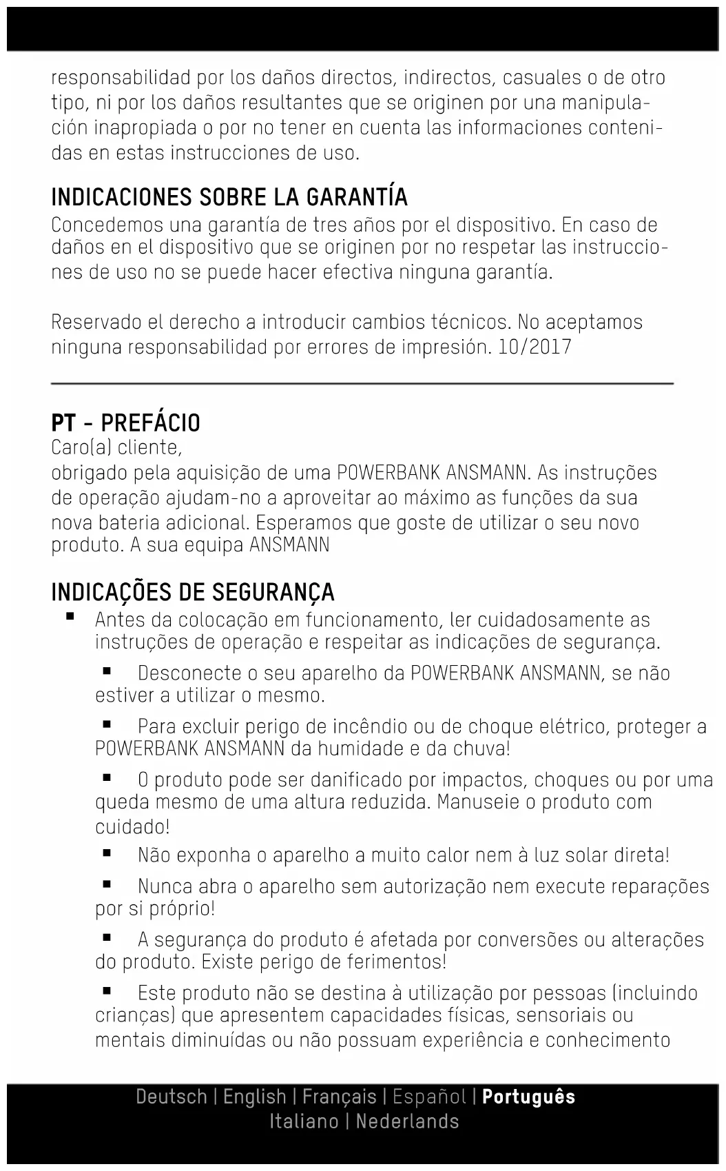 Antes da colocação em funcionamento, ler cuidadosamente as instruções de operação e respeitar as indicações de segurança. Desconecte o seu aparelho da POWERBANK ANSMANN, se não estiver a utilizar o mesmo. Para excluir perigo de incêndio ou de choque elétrico, proteger a POWERBANK ANSMANN da humidade e da chuva! O produto pode ser danificado por impactos, choques ou por uma queda mesmo de uma altura reduzida. Manuseie o produto com cuidado! Não exponha o aparelho a muito calor nem à luz solar direta! Nunca abra o aparelho sem autorização nem execute reparações por si próprio! A segurança do produto é afetada por conversões ou alterações do produto. Existe perigo de ferimentos! Este produto não se destina à utilização por pessoas (incluindo crianças) que apresentem capacidades físicas, sensoriais ou mentais diminuídas ou não possuam experiência e conhecimento Deutsch | English | Français | Español | Português Italiano | Nederlandsrelativamente ao manuseamento deste produto. Tais pessoas devem ser, em primeiro lugar, instruídas por um supervisor responsável pela sua segurança e supervisionadas durante a operação do aparelho! A inobservância das indicações de segurança pode causar danos na POWERBANK, no aparelho ligado ou ferimentos graves a pessoas! Se tiver questões, contacte o seu distribuidor local ou o nosso serviço de assistência.