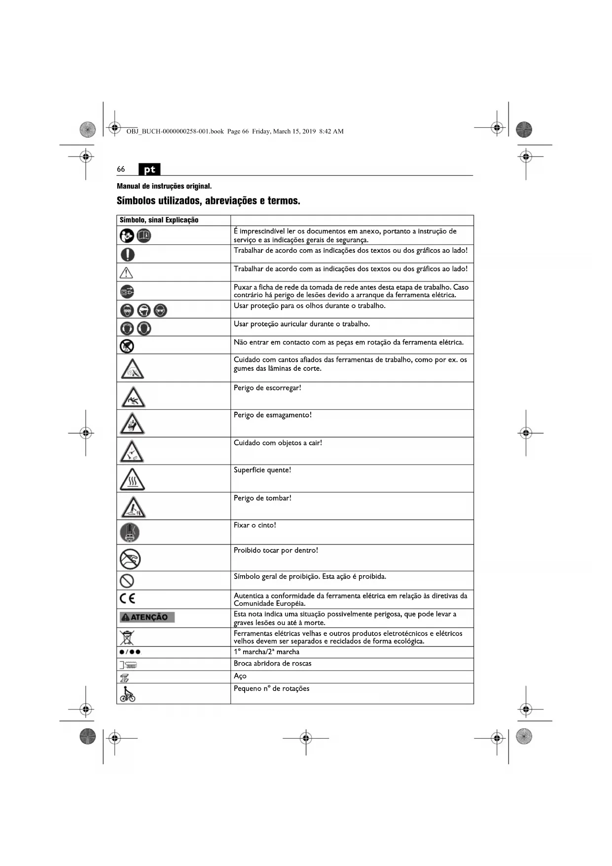 Manual de instruções original. Símbolos utilizados, abreviações e termos. Símbolo, sinal Explicação É imprescindível ler os documentos em anexo, portanto a instrução de serviço e as indicações gerais de segurança. Trabalhar de acordo com as indicações dos textos ou dos gráficos ao lado! Trabalhar de acordo com as indicações dos textos ou dos gráficos ao lado! Puxar a ficha de rede da tomada de rede antes desta etapa de trabalho. Caso contrário há perigo de lesões devido a arranque da ferramenta elétrica. Usar proteção para os olhos durante o trabalho. Usar proteção auricular durante o trabalho. Não entrar em contacto com as peças em rotação da ferramenta elétrica. Cuidado com cantos afiados das ferramentas de trabalho, como por ex. os gumes das lâminas de corte. Perigo de escorregar! Perigo de esmagamento! Cuidado com objetos a cair! Superfície quente! Perigo de tombar! Fixar o cinto! Proibido tocar por dentro! Símbolo geral de proibição. Esta ação é proibida. Autentica a conformidade da ferramenta elétrica em relação às diretivas da Comunidade Européia. Esta nota indica uma situação possivelmente perigosa, que pode levar a graves lesões ou até à morte. Ferramentas elétricas velhas e outros produtos eletrotécnicos e elétricos velhos devem ser separados e reciclados de forma ecológica. 1° marcha/2ª marcha Broca abridora de roscas Aço Pequeno n° de rotações OBJ_BUCH-0000000258-001.book Page 66 Friday, March 15, 2019 8:42 AM67