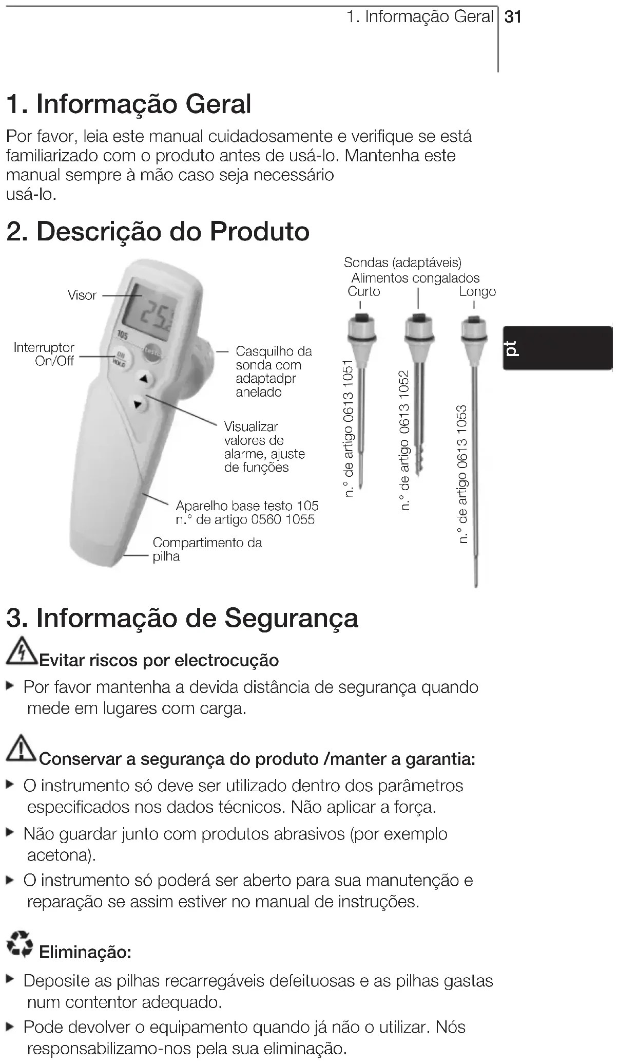 Evitar riscos por electrocução Por favor mantenha a devida distância de segurança quando mede em lugares com carga. Conservar a segurança do produto /manter a garantia: O instrumento só deve ser utilizado dentro dos parâmetros especificados nos dados técnicos. Não aplicar a força. Não guardar junto com produtos abrasivos (por exemplo acetona). O instrumento só poderá ser aberto para sua manutenção e reparação se assim estiver no manual de instruções. Eliminação: Deposite as pilhas recarregáveis defeituosas e as pilhas gastas num contentor adequado. Pode devolver o equipamento quando já não o utilizar. Nós responsabilizamo-nos pela sua eliminação.