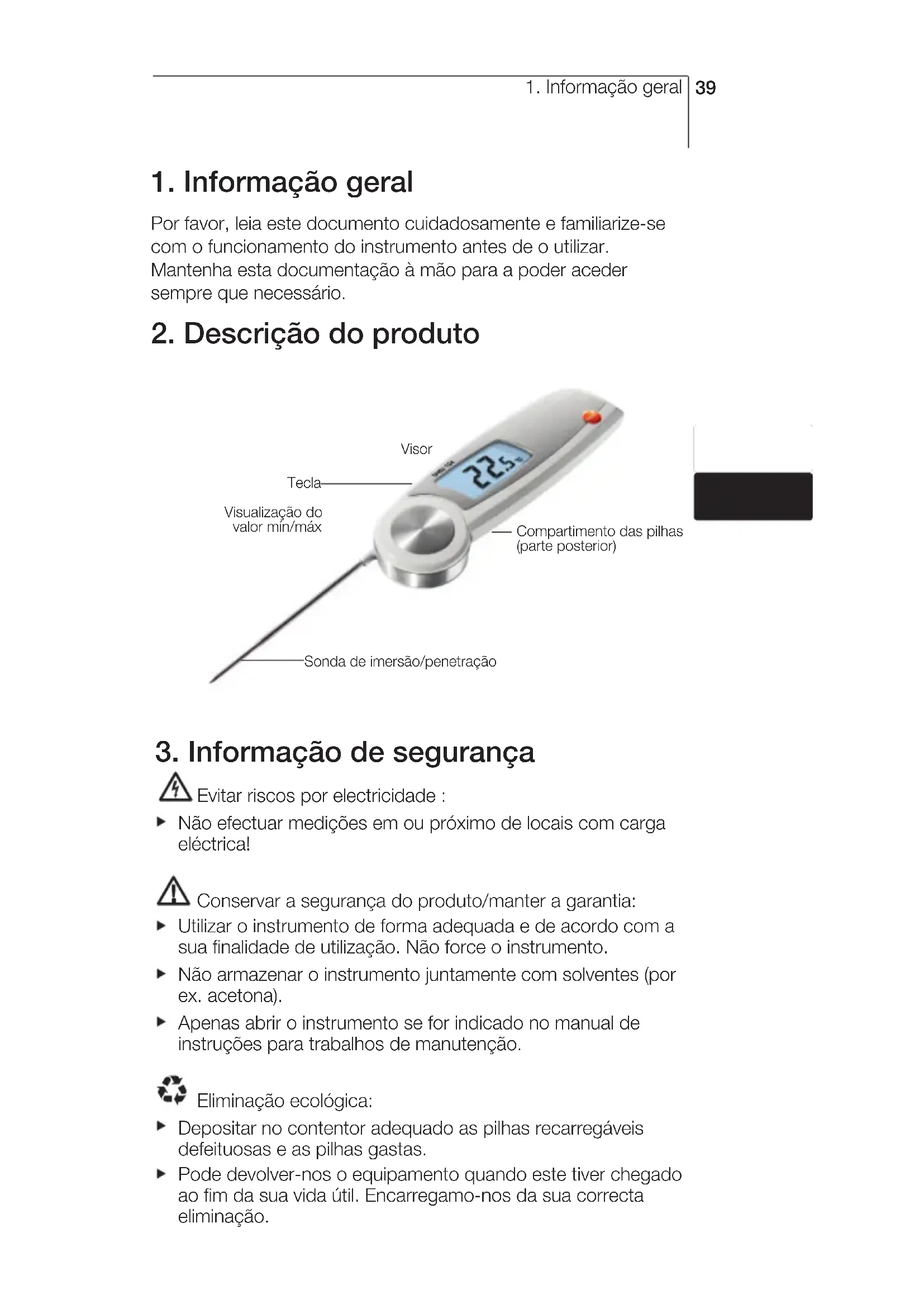 Evitar riscos por electricidade : Não efectuar medições em ou próximo de locais com carga eléctrica! Conservar a segurança do produto/manter a garantia: Utilizar o instrumento de forma adequada e de acordo com a sua finalidade de utilização. Não force o instrumento. Não armazenar o instrumento juntamente com solventes (por ex. acetona). Apenas abrir o instrumento se for indicado no manual de instruções para trabalhos de manutenção. Eliminação ecológica: Depositar no contentor adequado as pilhas recarregáveis defeituosas e as pilhas gastas. Pode devolver-nos o equipamento quando este tiver chegado ao fim da sua vida útil. Encarregamo-nos da sua correcta eliminação.