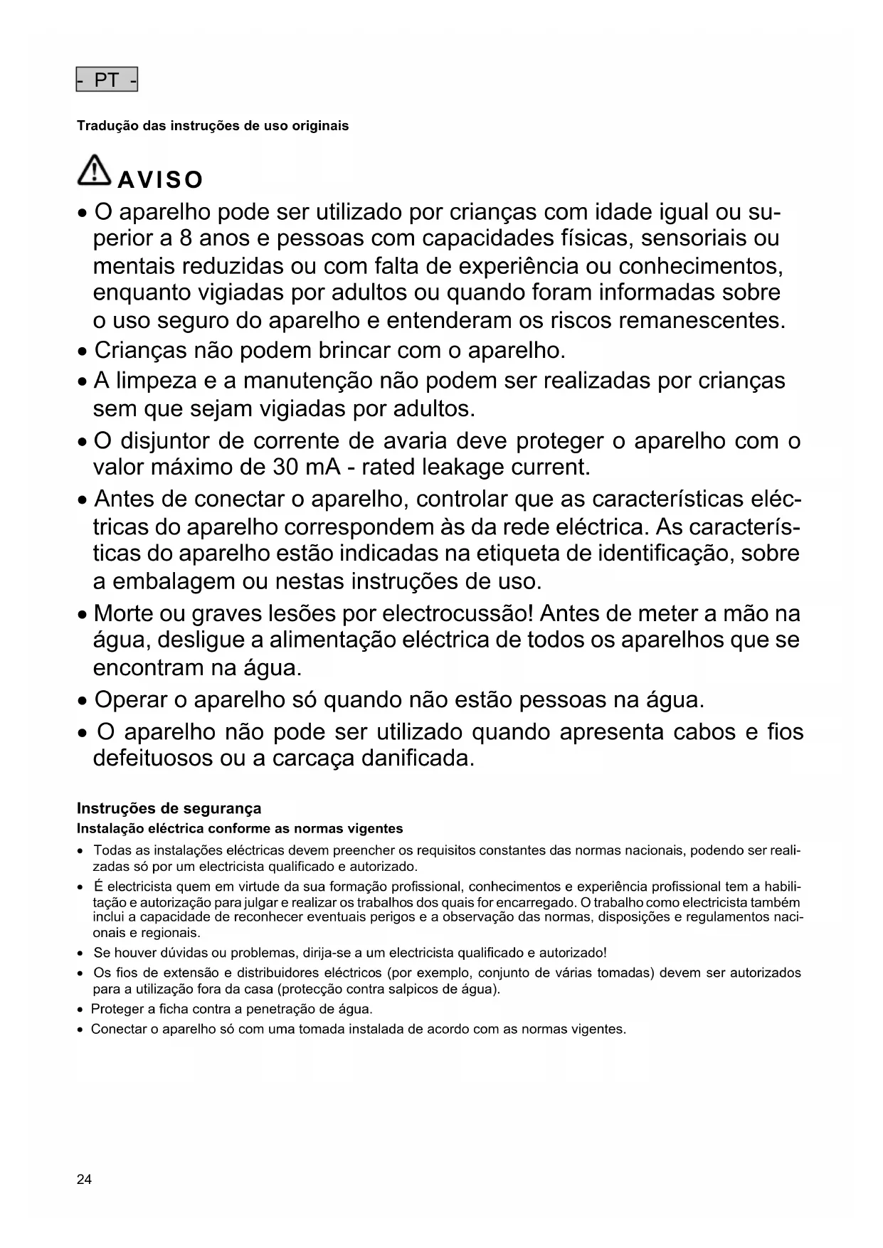 AVISO O aparelho pode ser utilizado por crianças com idade igual ou su- perior a 8 anos e pessoas com capacidades físicas, sensoriais ou mentais reduzidas ou com falta de experiência ou conhecimentos, enquanto vigiadas por adultos ou quando foram informadas sobre o uso seguro do aparelho e entenderam os riscos remanescentes. Crianças não podem brincar com o aparelho. A limpeza e a manutenção não podem ser realizadas por crianças sem que sejam vigiadas por adultos. O disjuntor de corrente de avaria deve proteger o aparelho com o valor máximo de 30 mA - rated leakage current. Antes de conectar o aparelho, controlar que as características eléc- tricas do aparelho correspondem às da rede eléctrica. As caracterís- ticas do aparelho estão indicadas na etiqueta de identificação, sobre a embalagem ou nestas instruções de uso. Morte ou graves lesões por electrocussão! Antes de meter a mão na água, desligue a alimentação eléctrica de todos os aparelhos que se encontram na água. Operar o aparelho só quando não estão pessoas na água. O aparelho não pode ser utilizado quando apresenta cabos e fios defeituosos ou a carcaça danificada.