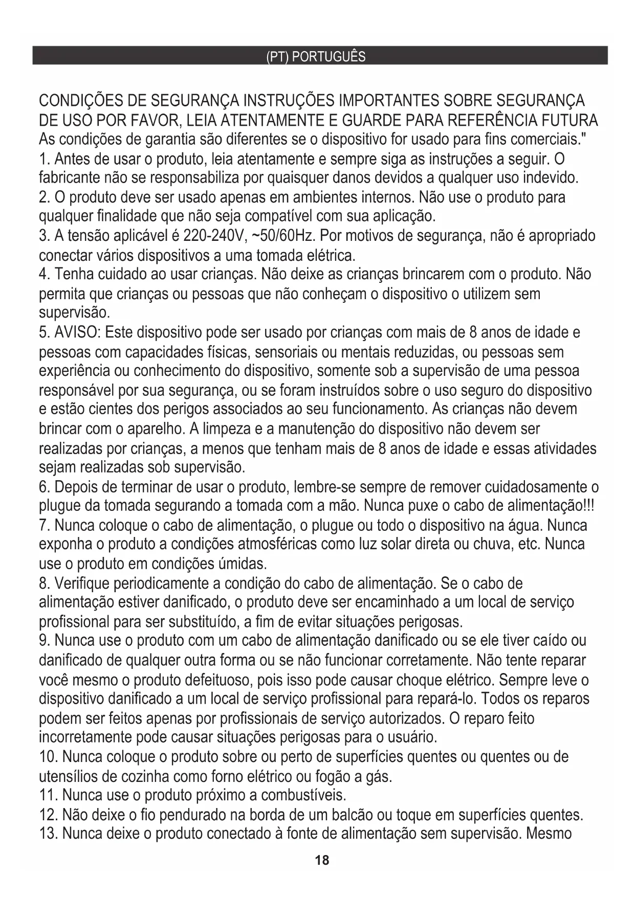 3. A tensão aplicável é 220-240V, ~50/60Hz. Por motivos de segurança, não é apropriado