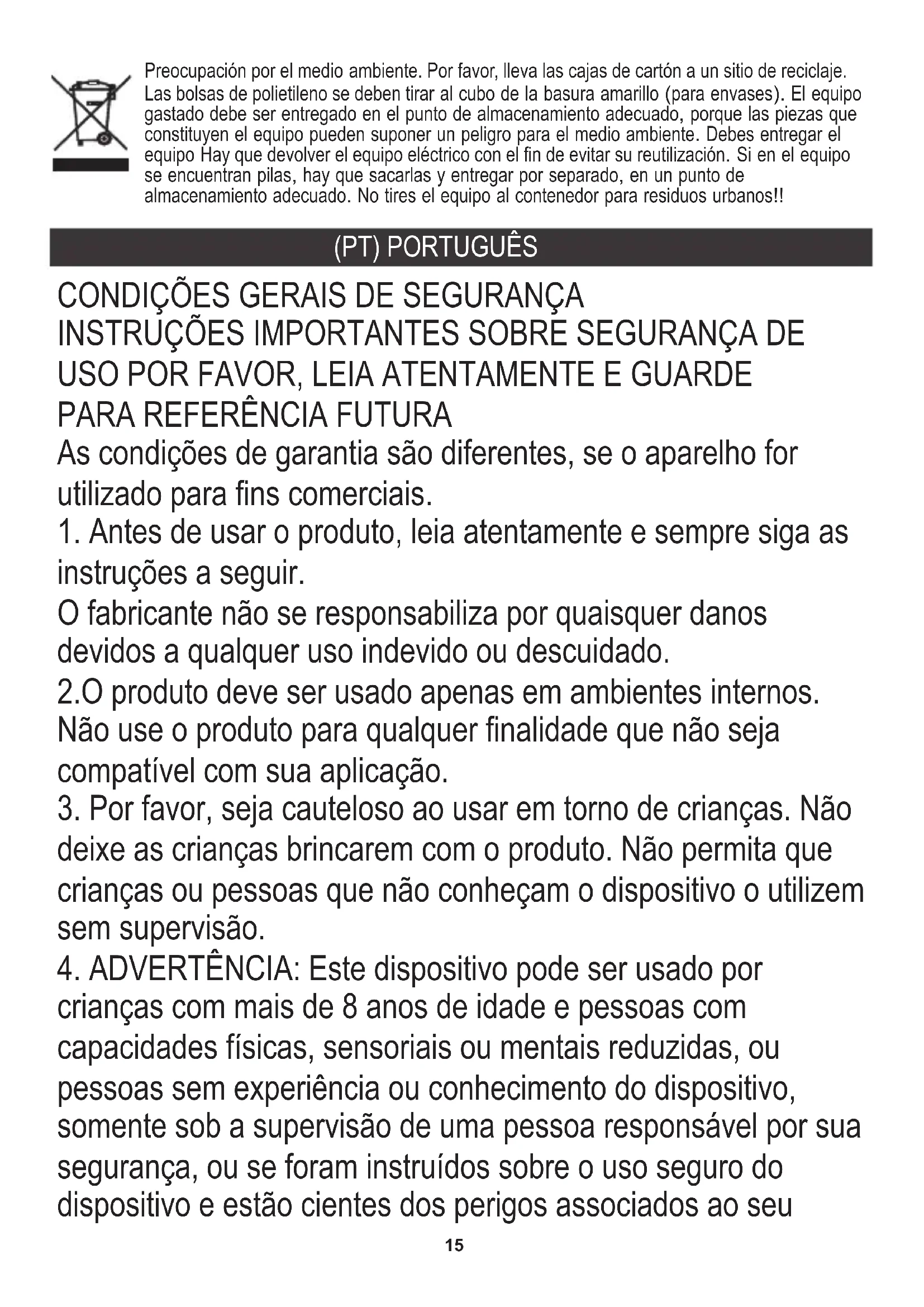 O fabricante não se responsabiliza por quaisquer danos devidos a qualquer uso indevido ou descuidado. As condições de garantia são diferentes, se o aparelho for utilizado para fins comerciais. INSTRUÇÕES IMPORTANTES SOBRE SEGURANÇA DE USO POR FAVOR, LEIA ATENTAMENTE E GUARDE