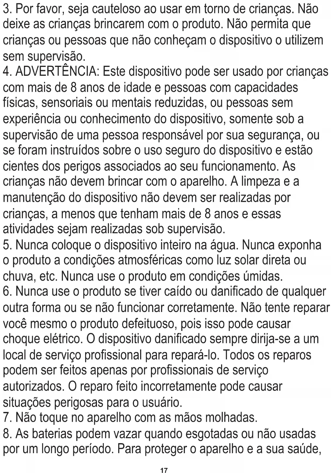 com mais de 8 anos de idade e pessoas com capacidades físicas, sensoriais ou mentais reduzidas, ou pessoas sem experiência ou conhecimento do dispositivo, somente sob a supervisão de uma pessoa responsável por sua segurança, ou se foram instruídos sobre o uso seguro do dispositivo e estão cientes dos perigos associados ao seu funcionamento. As crianças não devem brincar com o aparelho. A limpeza e a manutenção do dispositivo não devem ser realizadas por crianças, a menos que tenham mais de 8 anos e essas atividades sejam realizadas sob supervisão.