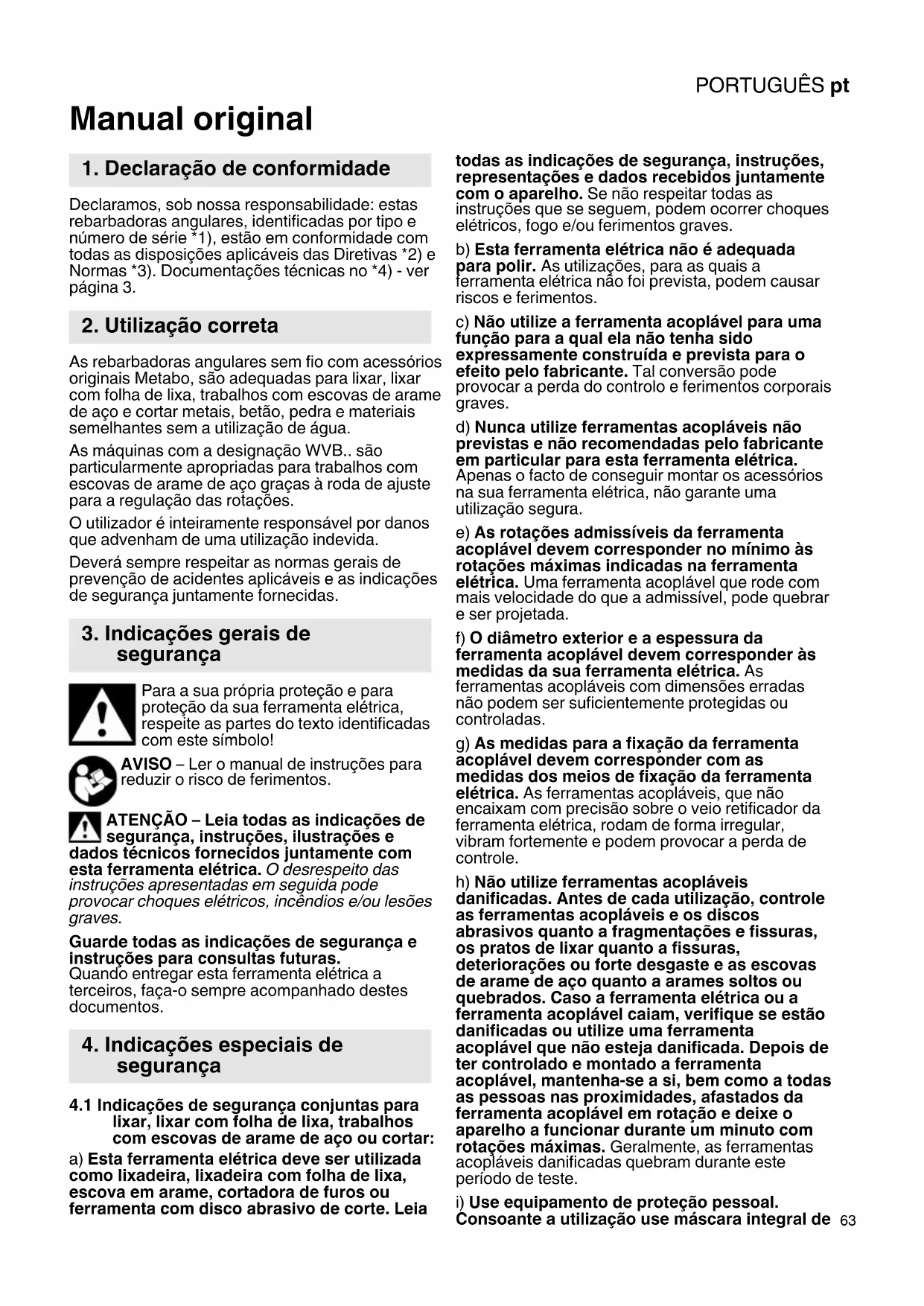 Manual original Declaramos, sob nossa responsabilidade: estas rebarbadoras angulares, identificadas por tipo e número de série *1), estão em conformidade com todas as disposições aplicáveis das Diretivas *2) e Normas *3). Documentações técnicas no *4) - ver página 3. As rebarbadoras angulares sem fio com acessórios originais Metabo, são adequadas para lixar, lixar com folha de lixa, trabalhos com escovas de arame de aço e cortar metais, betão, pedra e materiais semelhantes sem a utilização de água. As máquinas com a designação WVB.. são particularmente apropriadas para trabalhos com escovas de arame de aço graças à roda de ajuste para a regulação das rotações. O utilizador é inteiramente responsável por danos que advenham de uma utilização indevida. Deverá sempre respeitar as normas gerais de prevenção de acidentes aplicáveis e as indicações de segurança juntamente fornecidas. Para a sua própria proteção e para proteção da sua ferramenta elétrica, respeite as partes do texto identificadas com este símbolo! AVISO – Ler o manual de instruções para reduzir o risco de ferimentos. ATENÇÃO – Leia todas as indicações de segurança, instruções, ilustrações e dados técnicos fornecidos juntamente com esta ferramenta elétrica. O desrespeito das instruções apresentadas em seguida pode provocar choques elétricos, incêndios e/ou lesões graves. Guarde todas as indicações de segurança e instruções para consultas futuras. Quando entregar esta ferramenta elétrica a terceiros, faça-o sempre acompanhado destes documentos.