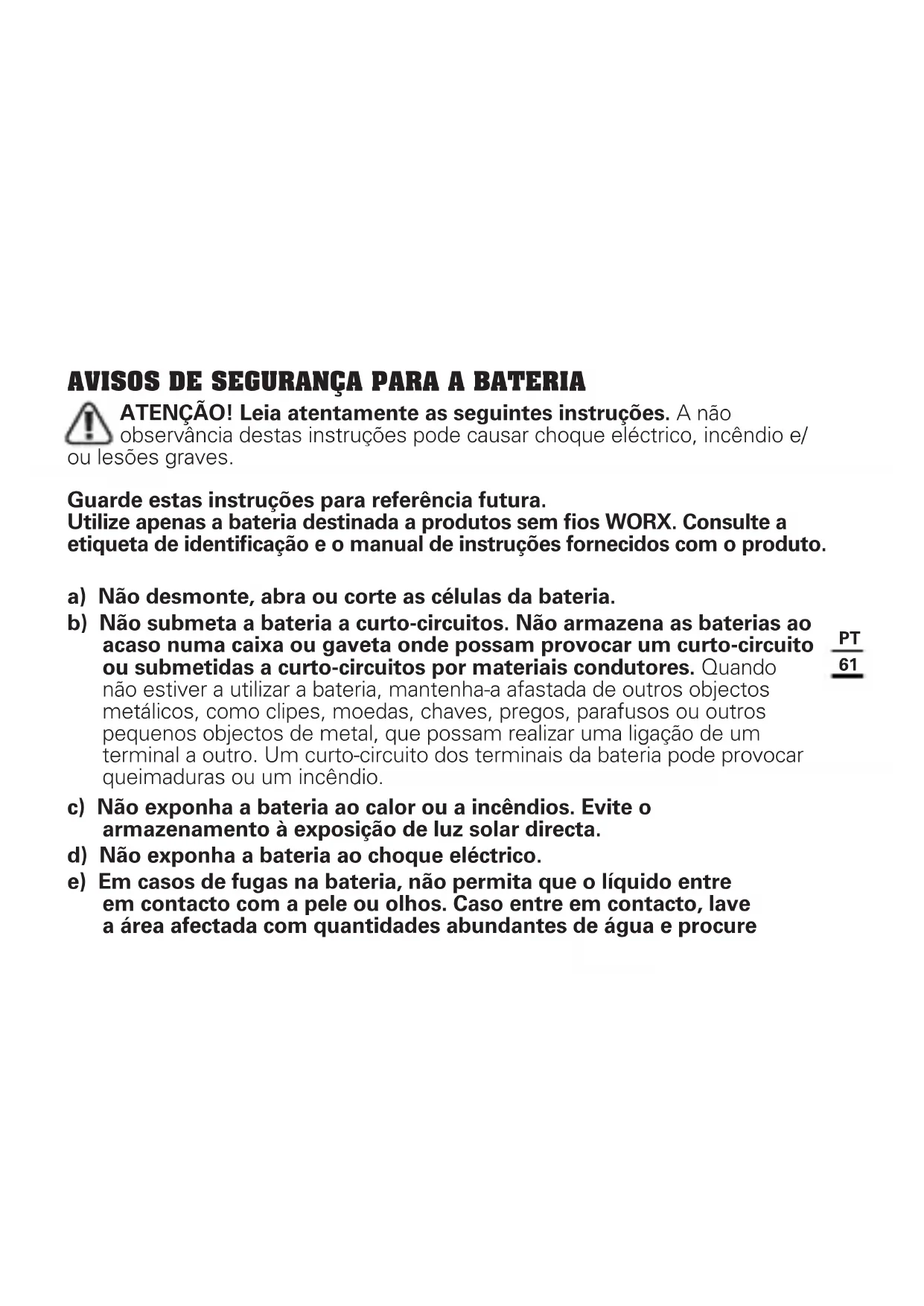 AVISOS DE SEGURANÇA PARA A BATERIA ATENÇÃO! Leia atentamente as seguintes instruções. A não observância destas instruções pode causar choque eléctrico, incêndio e/ ou lesões graves. Guarde estas instruções para referência futura. Utilize apenas a bateria destinada a produtos sem fios WORX. Consulte a etiqueta de identificação e o manual de instruções fornecidos com o produto. a) Não desmonte, abra ou corte as células da bateria. b) Não submeta a bateria a curto-circuitos. Não armazena as baterias ao acaso numa caixa ou gaveta onde possam provocar um curto-circuito ou submetidas a curto-circuitos por materiais condutores. Quando não estiver a utilizar a bateria, mantenha-a afastada de outros objectos metálicos, como clipes, moedas, chaves, pregos, parafusos ou outros pequenos objectos de metal, que possam realizar uma ligação de um terminal a outro. Um curto-circuito dos terminais da bateria pode provocar queimaduras ou um incêndio. c) Não exponha a bateria ao calor ou a incêndios. Evite o armazenamento à exposição de luz solar directa. d) Não exponha a bateria ao choque eléctrico. e) Em casos de fugas na bateria, não permita que o líquido entre em contacto com a pele ou olhos. Caso entre em contacto, lave a área afectada com quantidades abundantes de água e procure62