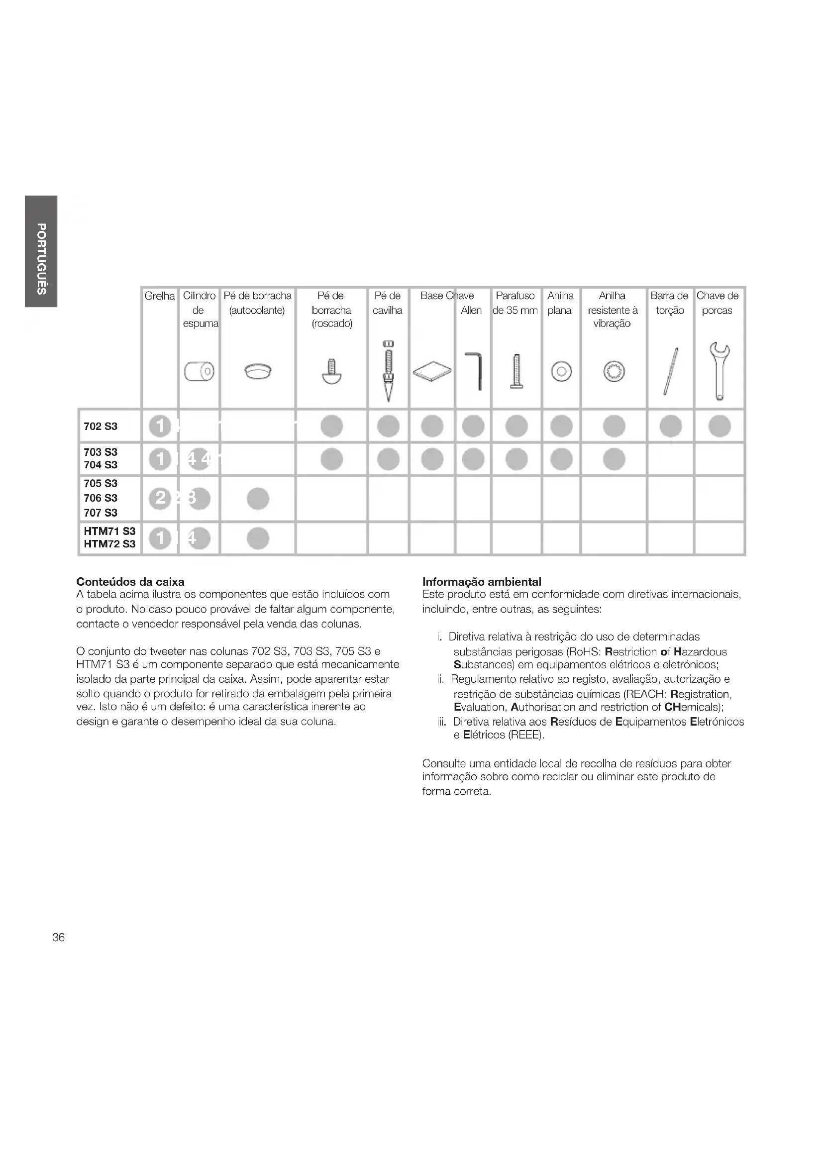 PORTUGUÊS Conteúdos da caixa A tabela acima ilustra os componentes que estão incluídos com o produto. No caso pouco provável de faltar algum componente, contacte o vendedor responsável pela venda das colunas. O conjunto do tweeter nas colunas 702S3, 703S3, 705S3 e HTM71S3 é um componente separado que está mecanicamente isolado da parte principal da caixa. Assim, pode aparentar estar solto quando o produto for retirado da embalagem pela primeira vez. Isto não é um defeito: é uma característica inerente ao design e garante o desempenho ideal da sua coluna. Informação ambiental Este produto está em conformidade com diretivas internacionais, incluindo, entre outras, as seguintes: