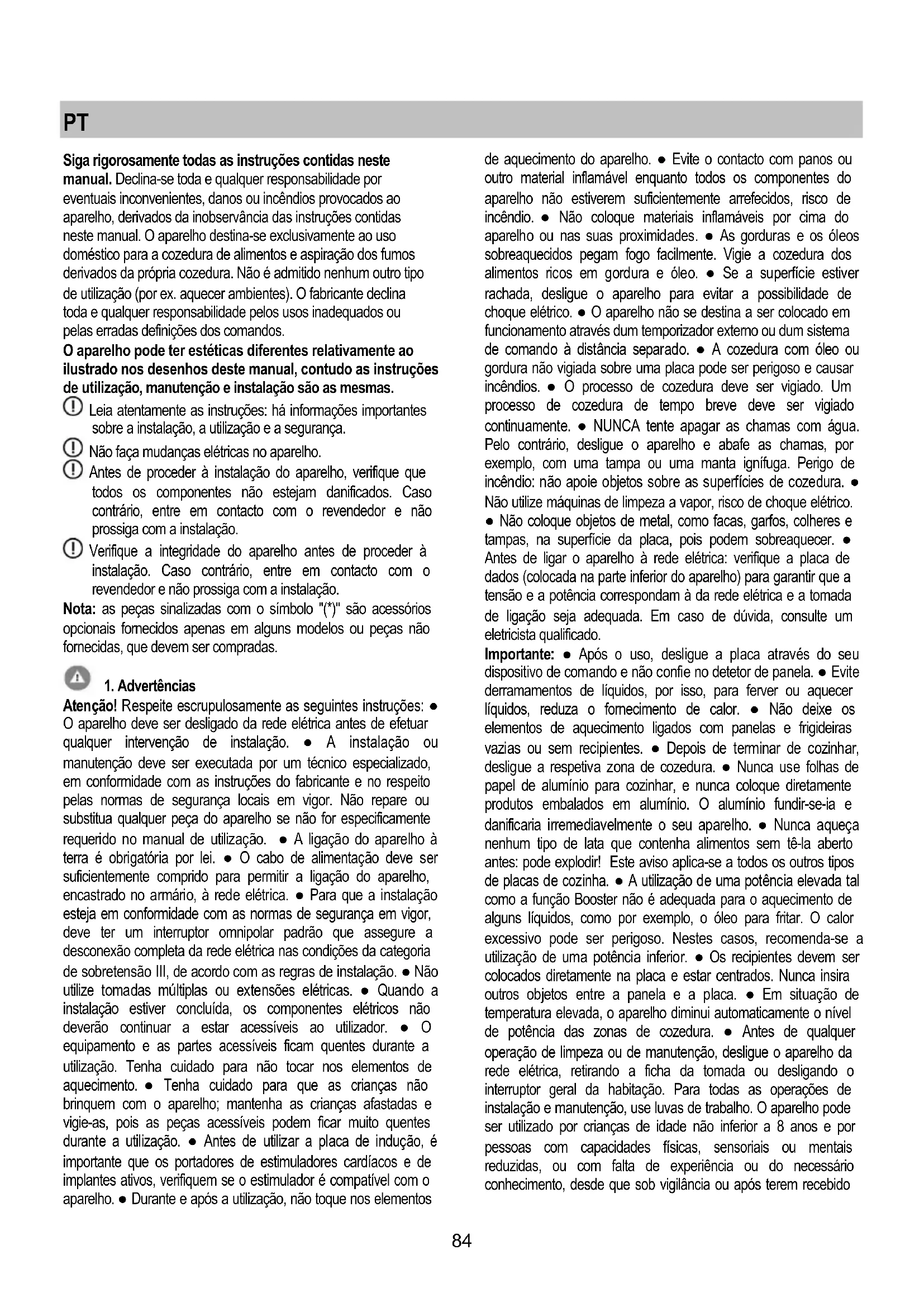 Atenção! Respeite escrupulosamente as seguintes instruções: ● O aparelho deve ser desligado da rede elétrica antes de efetuar qualquer intervenção de instalação. ● A instalação ou manutenção deve ser executada por um técnico especializado, em conformidade com as instruções do fabricante e no respeito pelas normas de segurança locais em vigor. Não repare ou substitua qualquer peça do aparelho se não for especificamente requerido no manual de utilização. ● A ligação do aparelho à terra é obrigatória por lei. ● O cabo de alimentação deve ser suficientemente comprido para permitir a ligação do aparelho, encastrado no armário, à rede elétrica. ● Para que a instalação esteja em conformidade com as normas de segurança em vigor, deve ter um interruptor omnipolar padrão que assegure a desconexão completa da rede elétrica nas condições da categoria de sobretensão III, de acordo com as regras de instalação. ● Não utilize tomadas múltiplas ou extensões elétricas. ● Quando a instalação estiver concluída, os componentes elétricos não deverão continuar a estar acessíveis ao utilizador. ● O equipamento e as partes acessíveis ficam quentes durante a utilização. Tenha cuidado para não tocar nos elementos de aquecimento. ● Tenha cuidado para que as crianças não brinquem com o aparelho; mantenha as crianças afastadas e vigie-as, pois as peças acessíveis podem ficar muito quentes durante a utilização. ● Antes de utilizar a placa de indução, é importante que os portadores de estimuladores cardíacos e de implantes ativos, verifiquem se o estimulador é compatível com o aparelho. ● Durante e após a utilização, não toque nos elementos de aquecimento do aparelho. ● Evite o contacto com panos ou outro material inflamável enquanto todos os componentes do aparelho não estiverem suficientemente arrefecidos, risco de incêndio. ● Não coloque materiais inflamáveis por cima do aparelho ou nas suas proximidades. ● As gorduras e os óleos sobreaquecidos pegam fogo facilmente. Vigie a cozedura dos alimentos ricos em gordura e óleo. ● Se a superfície estiver rachada, desligue o aparelho para evitar a possibilidade de choque elétrico. ● O aparelho não se destina a ser colocado em funcionamento através dum temporizador externo ou dum sistema de comando à distância separado. ● A cozedura com óleo ou gordura não vigiada sobre uma placa pode ser perigoso e causar incêndios. ● O processo de cozedura deve ser vigiado. Um processo de cozedura de tempo breve deve ser vigiado continuamente. ● NUNCA tente apagar as chamas com água. Pelo contrário, desligue o aparelho e abafe as chamas, por exemplo, com uma tampa ou uma manta ignífuga. Perigo de incêndio: não apoie objetos sobre as superfícies de cozedura. ● Não utilize máquinas de limpeza a vapor, risco de choque elétrico. ● Não coloque objetos de metal, como facas, garfos, colheres e tampas, na superfície da placa, pois podem sobreaquecer. ● Antes de ligar o aparelho à rede elétrica: verifique a placa de dados (colocada na parte inferior do aparelho) para garantir que a tensão e a potência correspondam à da rede elétrica e a tomada de ligação seja adequada. Em caso de dúvida, consulte um eletricista qualificado. Importante: ● Após o uso, desligue a placa através do seu dispositivo de comando e não confie no detetor de panela. ● Evite derramamentos de líquidos, por isso, para ferver ou aquecer líquidos, reduza o fornecimento de calor. ● Não deixe os elementos de aquecimento ligados com panelas e frigideiras vazias ou sem recipientes. ● Depois de terminar de cozinhar, desligue a respetiva zona de cozedura. ● Nunca use folhas de papel de alumínio para cozinhar, e nunca coloque diretamente produtos embalados em alumínio. O alumínio fundir-se-ia e danificaria irremediavelmente o seu aparelho. ● Nunca aqueça nenhum tipo de lata que contenha alimentos sem tê-la aberto antes: pode explodir! Este aviso aplica-se a todos os outros tipos de placas de cozinha. ● A utilização de uma potência elevada tal como a função Booster não é adequada para o aquecimento de alguns líquidos, como por exemplo, o óleo para fritar. O calor excessivo pode ser perigoso. Nestes casos, recomenda-se a utilização de uma potência inferior. ● Os recipientes devem ser colocados diretamente na placa e estar centrados. Nunca insira outros objetos entre a panela e a placa. ● Em situação de temperatura elevada, o aparelho diminui automaticamente o nível de potência das zonas de cozedura. ● Antes de qualquer operação de limpeza ou de manutenção, desligue o aparelho da rede elétrica, retirando a ficha da tomada ou desligando o interruptor geral da habitação. Para todas as operações de instalação e manutenção, use luvas de trabalho. O aparelho pode ser utilizado por crianças de idade não inferior a 8 anos e por pessoas com capacidades físicas, sensoriais ou mentais reduzidas, ou com falta de experiência ou do necessário conhecimento, desde que sob vigilância ou após terem recebido85 instruções acerca do uso do aparelho em segurança e da compreensão dos perigos a ele inerentes. ● As crianças devem ser vigiadas para que não brinquem com o aparelho. ● A limpeza e a manutenção não devem ser efetuadas por crianças sem vigilância. O local deve dispor de ventilação suficiente quando o aparelho for utilizado em simultâneo com outros aparelhos de combustão a gás ou outros combustíveis. ● O aparelho deve ser limpo frequentemente, quer no seu interior quer no seu exterior (PELO MENOS UMA VEZ POR MÊS), contudo respeite as indicações expressas nas instruções de manutenção. O incumprimento das normas de limpeza do aparelho e da substituição e limpeza dos filtros implica risco de incêndio. ● É estritamente proibida a cozedura flambê. ● O uso de chama aberta é prejudicial para os filtros 