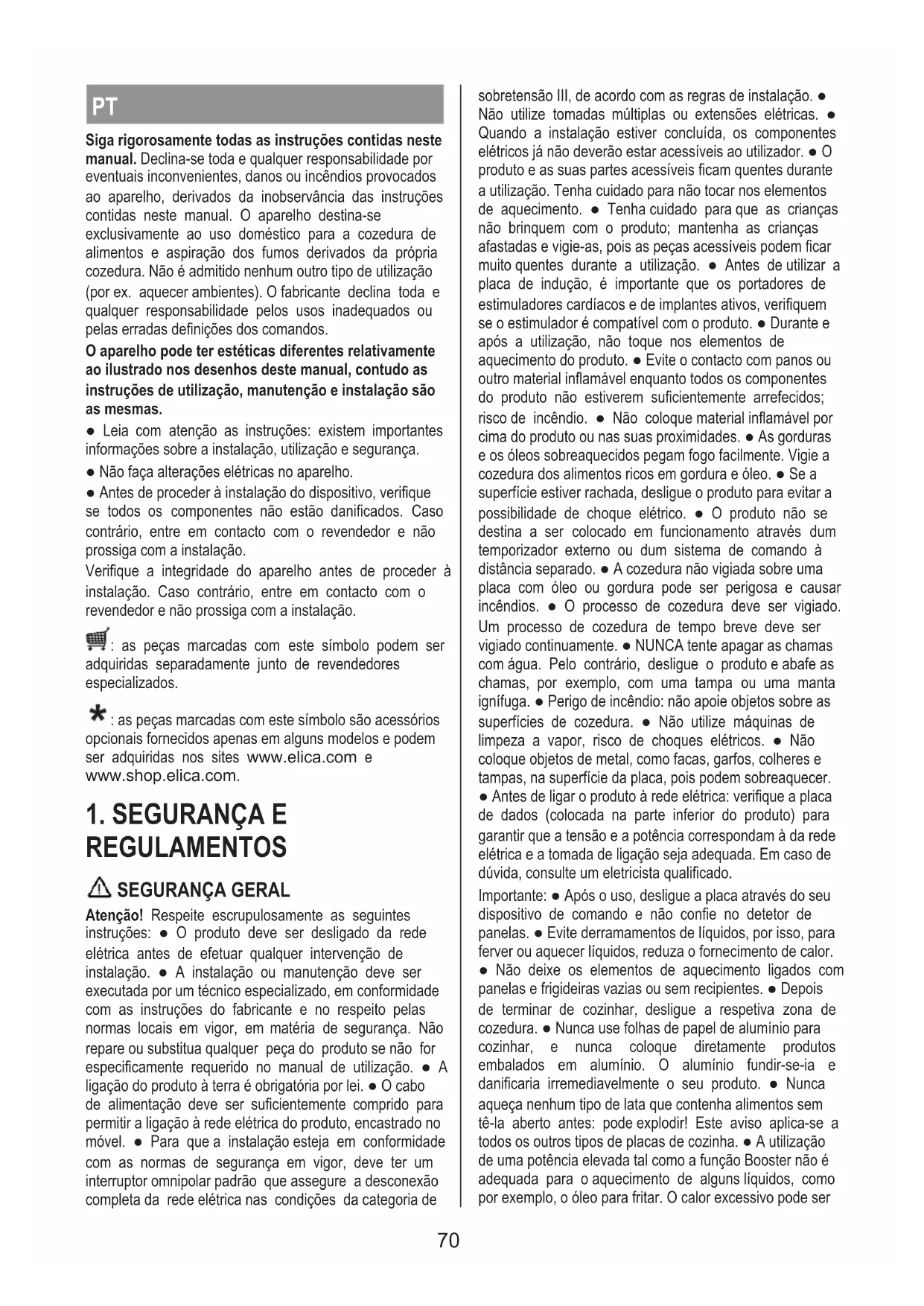 Si tras realizar las verificaciones arriba descritas, el problema persiste, contacte con el Servicio de Asistencia técni- ca más cercano. 69PT Siga rigorosamente todas as instruções contidas neste manual. Declina-se toda e qualquer responsabilidade por eventuais inconvenientes, danos ou incêndios provocados ao aparelho, derivados da inobservância das instruções contidas neste manual. O aparelho destina-se exclusivamente ao uso doméstico para a cozedura de alimentos e aspiração dos fumos derivados da própria cozedura. Não é admitido nenhum outro tipo de utilização (por ex. aquecer ambientes). O fabricante declina toda e qualquer responsabilidade pelos usos inadequados ou pelas erradas definições dos comandos. O aparelho pode ter estéticas diferentes relativamente ao ilustrado nos desenhos deste manual, contudo as instruções de utilização, manutenção e instalação são as mesmas. ● Leia com atenção as instruções: existem importantes informações sobre a instalação, utilização e segurança. ● Não faça alterações elétricas no aparelho. ● Antes de proceder à instalação do dispositivo, verifique se todos os componentes não estão danificados. Caso contrário, entre em contacto com o revendedor e não prossiga com a instalação. Verifique a integridade do aparelho antes de proceder à instalação. Caso contrário, entre em contacto com o revendedor e não prossiga com a instalação. : as peças marcadas com este símbolo podem ser adquiridas separadamente junto de revendedores especializados. : as peças marcadas com este símbolo são acessórios opcionais fornecidos apenas em alguns modelos e podem ser adquiridas nos sites www.elica.com e www.shop.elica.com.