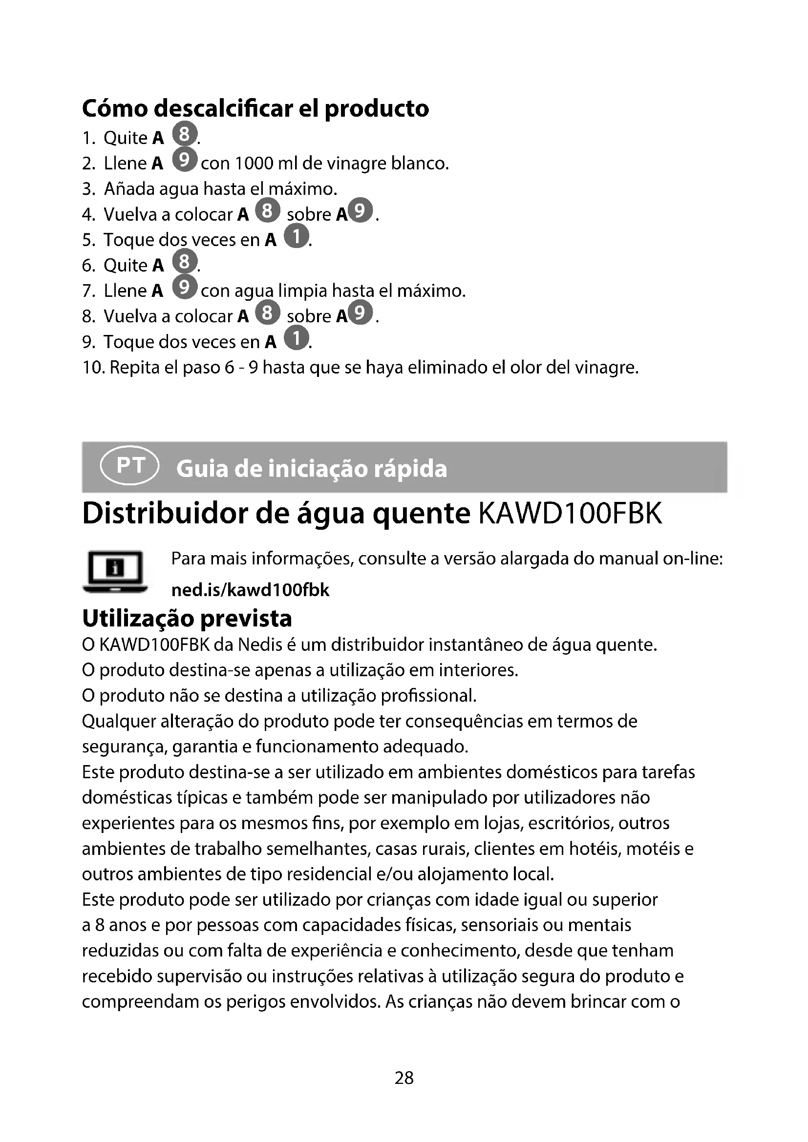 Guia de iniciação rápida Distribuidor de água quente KAWD100FBK Para mais informações, consulte a versão alargada do manual on-line: ned.is/kawd100fbk Utilização prevista O KAWD100FBK da Nedis é um distribuidor instantâneo de água quente. O produto destina-se apenas a utilização em interiores. O produto não se destina a utilização prossional. Qualquer alteração do produto pode ter consequências em termos de segurança, garantia e funcionamento adequado. Este produto destina-se a ser utilizado em ambientes domésticos para tarefas domésticas típicas e também pode ser manipulado por utilizadores não experientes para os mesmos ns, por exemplo em lojas, escritórios, outros ambientes de trabalho semelhantes, casas rurais, clientes em hotéis, motéis e outros ambientes de tipo residencial e/ou alojamento local. Este produto pode ser utilizado por crianças com idade igual ou superior a 8 anos e por pessoas com capacidades físicas, sensoriais ou mentais reduzidas ou com falta de experiência e conhecimento, desde que tenham recebido supervisão ou instruções relativas à utilização segura do produto e compreendam os perigos envolvidos. As crianças não devem brincar com o KAWD100FBK_MAN_COMP_0520_print_(20161 1422)_v00.01.indd 28KAWD100FBK_MAN_COMP_0520_print_(20161 1422)_v00.01.indd 28 18-05-2020 09:0818-05-2020 09:0829 produto. A limpeza e a manutenção destinadas ao utilizador não devem ser efetuadas por crianças sem supervisão. Especicações Produto Distribuidor de água quente Número de artigo KAWD100FBK Dimensões (p x l x a) 240 x 140 x 300 mm Peso 1595 g Alimentação 220 - 240 VAC / 50/60 Hz Consumo de energia 2200 - 2600 W Potência em espera 0,5 W Quantidade de água 0,5 - 2,5 L Peças principais (imagem A)