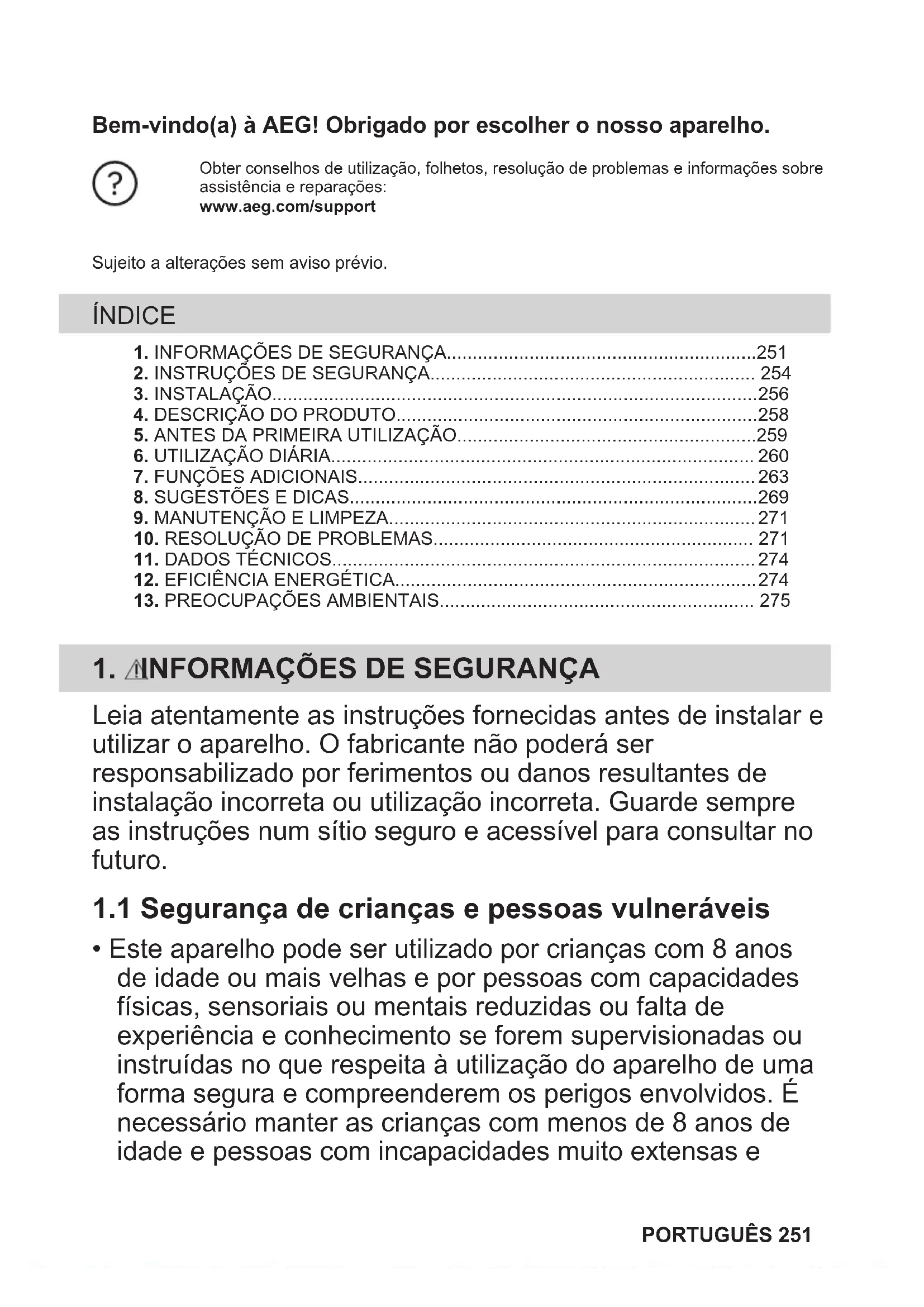 - Este aparelho pode ser utilizado por crianças com 8 anos de idade ou mais velhas e por pessoas com capacidades físicas, sensoriais ou mentais reduzidas ou falta de experiência e conhecimento se forem supervisionadas ou instruídas no que respeita à utilização do aparelho de uma forma segura e compreenderem os perigos envolvidos. É necessário manter as crianças com menos de 8 anos de idade e pessoas com incapacidades muito extensas e PORTUGUÊS 251complexas afastadas do aparelho, a menos que sejam constantemente vigiadas.