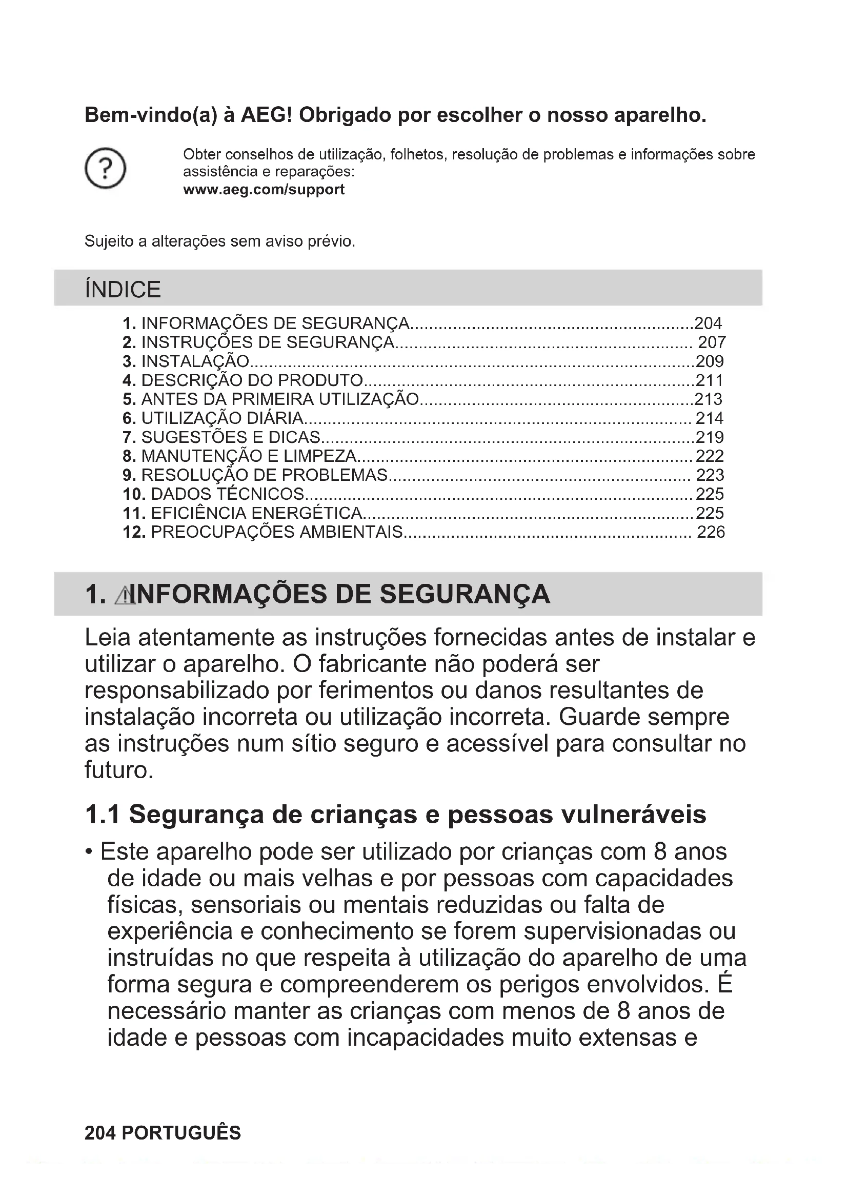 - Este aparelho pode ser utilizado por crianças com 8 anos de idade ou mais velhas e por pessoas com capacidades físicas, sensoriais ou mentais reduzidas ou falta de experiência e conhecimento se forem supervisionadas ou instruídas no que respeita à utilização do aparelho de uma forma segura e compreenderem os perigos envolvidos. É necessário manter as crianças com menos de 8 anos de idade e pessoas com incapacidades muito extensas e 204 PORTUGUÊScomplexas afastadas do aparelho, a menos que sejam constantemente vigiadas.