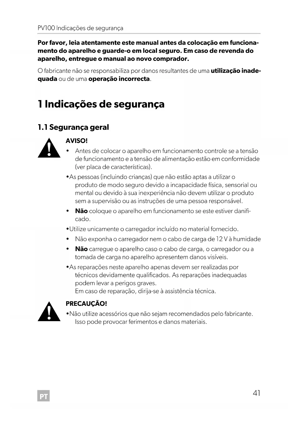 - Não utilize acessórios que não sejam recomendados pelo fabricante. Isso pode provocar ferimentos e danos materiais. PV100-O-16s.book Seite 41 Montag, 29. August 2016 3:47 15PT Indicações de segurança PV100