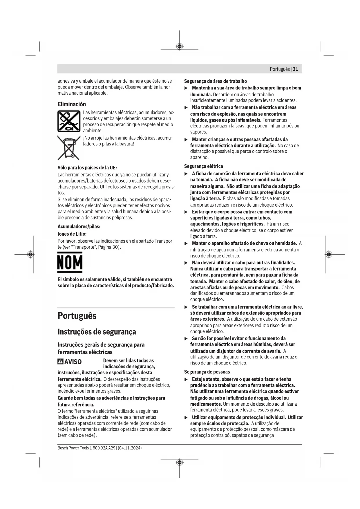 O nível de vibrações indicado nestas instruções e o valor de emissões sonoras foram medidos de acordo com um processo de medição normalizado e podem ser utilizados para a comparação de ferramentas elétricas. Também são adequados para uma avaliação provisória das emissões sonoras e de vibrações. O nível de vibrações indicado e o valor de emissões sonoras representam as aplicações principais da ferramenta elétrica. Se a ferramenta elétrica for utilizada para outras aplicações, com outras ferramentas de trabalho ou com manutenção insuficiente, é possível que o nível de vibrações e de emissões sonoras seja diferente. Isto pode aumentar sensivelmente a emissão sonora e de vibrações para o período completo de trabalho. Para uma estimação exata da emissão sonora e de vibrações, também deveriam ser considerados os períodos nos quais o aparelho está desligado ou funciona, mas não está sendo utilizado. Isto pode reduzir a emissão sonora e de vibrações durante o completo período de trabalho. Além disso também deverão ser estipuladas medidas de segurança para proteger o operador contra o efeito de vibrações, como por exemplo: manutenção de ferramentas elétricas e acessórios, manter as mãos quentes e organização dos processos de trabalho. Bateria Carregar a bateria u Utilize apenas os carregadores listados nos dados técnicos. Só estes carregadores são apropriados para os baterias de lítio utilizadas para a sua ferramenta elétrica. Nota: devido a normas de transporte internacionais, as baterias de lítio são fornecidas parcialmente carregadas. Para assegurar a completa potência da bateria, a bateria deverá ser carregada completamente antes da primeira utilização. Colocar a bateria Insira a bateria carregada no respetivo encaixe, até que esta esteja engatada. Retirar a bateria Para retirar a bateria, pressione a respetiva tecla de desbloqueio e puxe a bateria para fora. Não empregue força. A bateriapossui 2 níveis de travamento, que devem evitar, que a bateria caia, caso a tecla de desbloqueio da bateriaseja premida por acaso. Enquanto a bateria estiver dentro da ferramenta elétrica, ela é mantida em posição por uma mola. Indicador do nível de carga da bateria O indicador do nível de carga da bateria (5) na ferramenta elétrica é composto por três LEDs verdes. Este indica o nível de carga da bateria durante alguns segundos após ligar e desligar. LED Capacidade Luz permanente 3x verde 60 – 100% Luz permanente 2x verde 30 – 60% Luz permanente 1x verde 10 – 30% Luz intermitente lenta 1x verde 0 – 10% Os 3 LEDs do indicador do nível de carga piscam rapidamente quando a temperatura da bateria está fora da faixa de temperatura de serviço de –30 até +70 °C e/ ou a proteção contra sobrecarga foi ativada. Indicações sobre o manuseio ideal da bateria Proteger a bateria contra humidade e água. Armazene a bateria apenas na faixa de temperatura de −20°C a 50°C. Por exemplo, não deixe a bateria dentro do automóvel no verão. Limpar de vez em quando as aberturas de ventilação da bateria com um pincel macio, limpo e seco. Um tempo de funcionamento reduzido após o carregamento indica que a bateria está gasta e que deve ser substituída. 1 609 92A A29 | (04.11.2024) Bosch Power ToolsPortuguês | 35 Observe as indicações sobre a eliminação de forma ecológica. Montagem u Antes de qualquer trabalho na ferramenta elétrica (p. ex. manutenção, troca de ferramenta, etc.) retire a bateria da mesma. Há perigo de ferimentos se o interruptor de ligar/desligar for acionado involuntariamente. Trocar/montar placa base e placa de espuma (ver figuras A1− A2) Desaperte por completo os 4 parafusos (11). Retire a placa base dos quatro pés oscilantes (7). Coloque a placa de troca nos quatro pés oscilantes (7) e pressione os pés oscilantes na reentrância (8). Coloque a placa de espuma. Fixe as duas partes das placas (placa base e placa de espuma) com parafusos (11). Ao trocar a placa de espuma não troque os componentes duros. Substituir a folha de lixar Antes de colocar uma folha de lixa nova, remova a sujidade e o pó da placa de lixar, p. ex. com um pincel. Para assegurar uma aspiração de pó ideal, certifique-se de que os orifícios puncionados na folha de lixa coincidem com os furos na placa de lixar. Folhas de lixa com fixação autoaderente (ver figuraB) Se a placa de lixar estiver equipada com um tecido de fixação autoaderente, pode fixar-se de forma rápida e fácil folhas de lixa com fixação autoaderente. Sacuda o tecido de fixação autoaderente da placa de lixar antes de colocar a folha de lixa (17), para permitir uma boa aderência. Coloque a folha de lixa (17) à face num lado da placa de lixar , depois coloque a folha de lixa e pressione-a bem. Para retirar a folha de lixa (17) pegue-a pela ponta e puxe-a da placa de lixar . Aspiração de pó/de aparas Pós de materiais como por exemplo, tintas que contém chumbo, alguns tipos de madeira e minerais, podem ser nocivos à saúde. O contacto ou a inalação dos pós pode provocar reações alérgicas e/ou doenças nas vias respiratórias do utilizador ou das pessoas que se encontrem por perto. Certos pós, como por exemplo pó de carvalho e faia são considerados como sendo cancerígenos, especialmente quando juntos com substâncias para o tratamento de madeiras (cromato, preservadores de madeira). Material que contém asbesto só deve ser processado por pessoal especializado. – Se possível deverá usar um dispositivo de aspiração de pó apropriado para o material. – Assegure uma boa ventilação do local de trabalho. – É recomendável usar uma máscara de proteção respiratória com filtro da classe P2. Observe as diretivas para os materiais a serem processados, vigentes no seu país. u Evite a acumulação de pó no local de trabalho. Pós podem entrar levemente em ignição. Aspiração integrada com saco do pó (ver figura