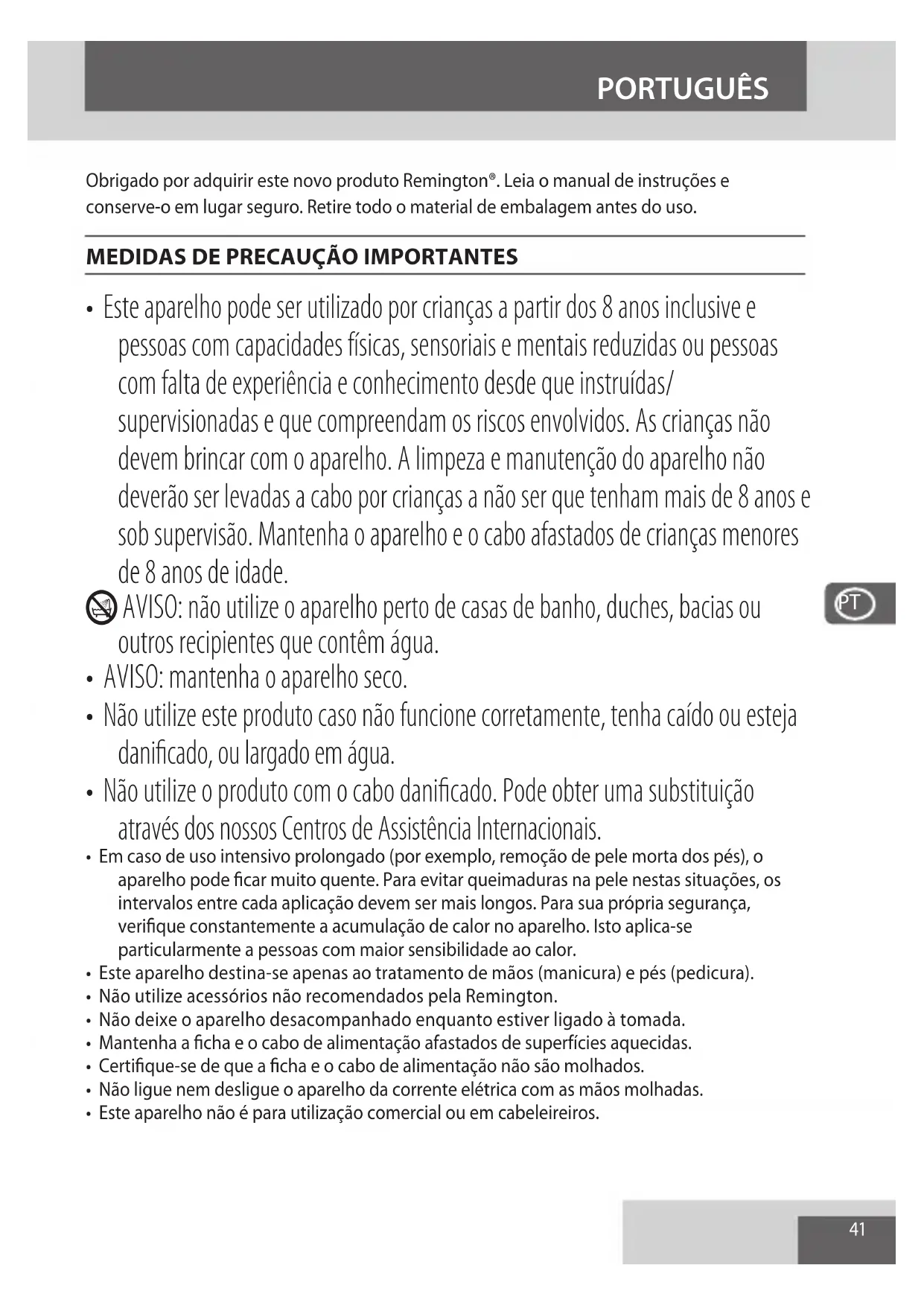 - Este aparelho pode ser utilizeso por cianças a partir dos 8 anos inclusive e pessoas com capacidades fisicas, sensoriais e mentalais reduzidas ou pessoas com falta de experiência e conheicao desde que instruidas/ supervisionadas e que comprehendam os ricos envolvidos. As cianças nao devem brincar com o aparelho. A limpeza e manutencao do aparelho nãodeerao ser levadas a cabo por cianças a nao ser que tenham mais de 8 anos e sob supervisao. Mantenha o aparelho e o cabo afastados de cianças meores de 8 anos de idade.