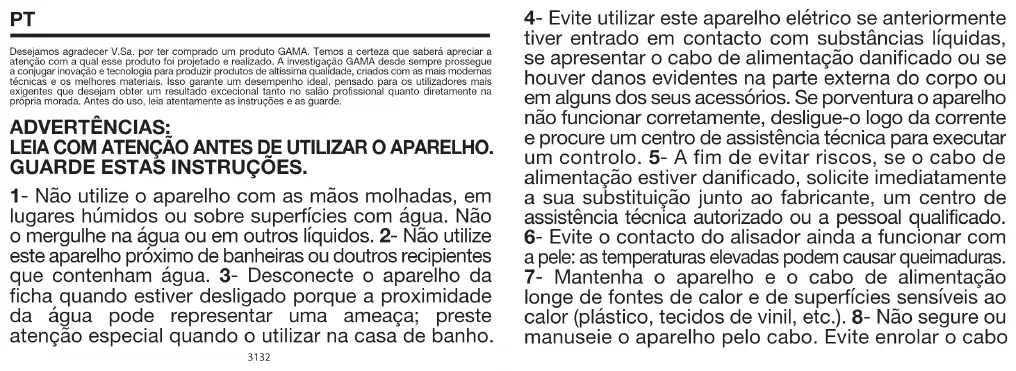 Luego de su uso, desenchufar el cable de alimentación y guardarlo en un lugar seco una vez enfriado. No enroscar el cable al aparato. No tomar nunca el aparato por el cable, servirse en cambio del gancho. En el sitio web www.gamaprofessional.com puedes encontrar los manuales de producto y las advertencias. 29 30PT Desejamos agradecer V.Sa. por ter comprado um produto GAMA. Temos a certeza que saberá apreciar a atenção com a qual esse produto foi projetado e realizado. A investigação GAMA desde sempre prossegue a conjugar inovação e tecnologia para produzir produtos de altíssima qualidade, criados com as mais modernas técnicas e os melhores materiais. Isso garante um desempenho ideal, pensado para os utilizadores mais exigentes que desejam obter um resultado excecional tanto no salão profissional quanto diretamente na própria morada. Antes do uso, leia atentamente as instruções e as guarde. ADVERTÊNCIAS: LEIA COM ATENÇÃO ANTES DE UTILIZAR O APARELHO. GUARDE ESTAS INSTRUÇÕES.