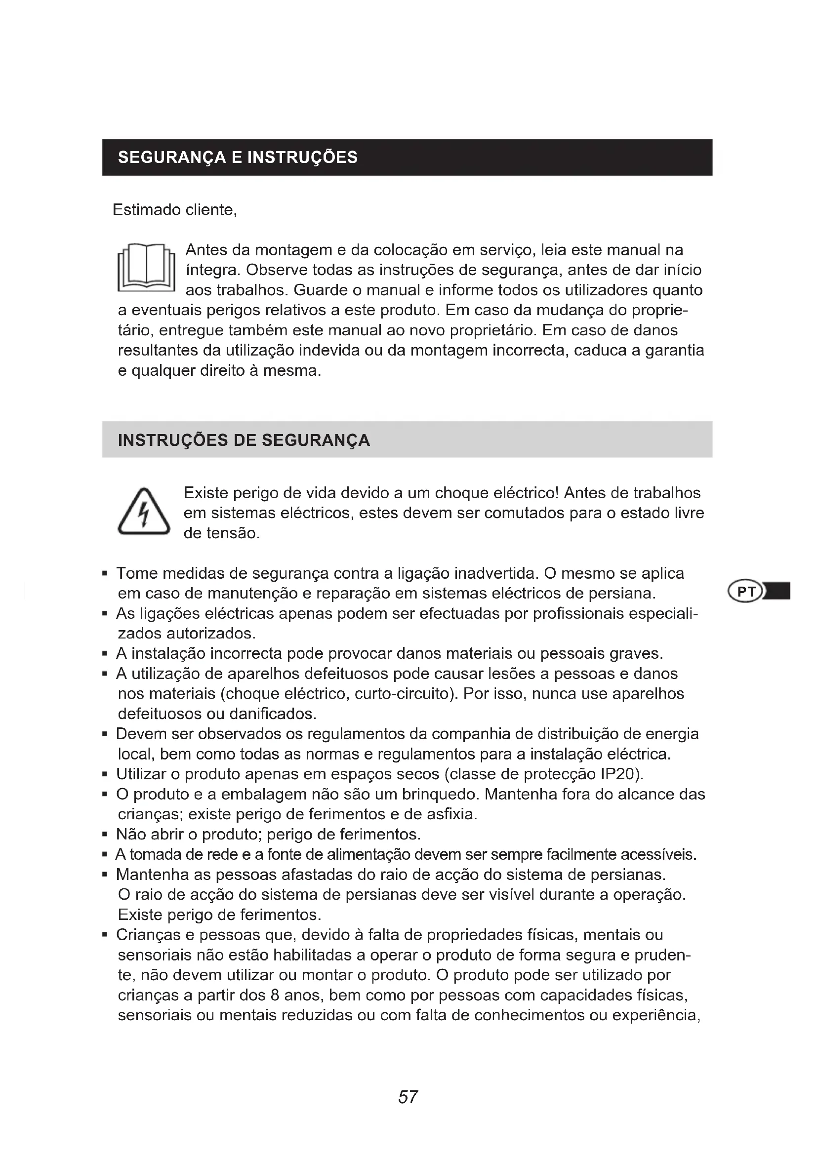 Existe perigo de vida devido a um choque eléctrico! Antes de trabalhos em sistemas eléctricos, estes devem ser comutados para o estado livre de tensão Tome medidas de segurança contra a ligação inadvertida O mesmo se aplica em caso de manutenção e reparação em sistemas eléctricos de persiana As ligações eléctricas apenas podem ser efectuadas por prossionais especiali- zados autorizados A instalação incorrecta pode provocar danos materiais ou pessoais graves A utilização de aparelhos defeituosos pode causar lesões a pessoas e danos nos materiais (choque eléctrico, curto-circuito). Por isso, nunca use aparelhos defeituosos ou danicados. Devem ser observados os regulamentos da companhia de distribuição de energia local, bem como todas as normas e regulamentos para a instalação eléctrica. Utilizar o produto apenas em espaços secos (classe de protecção IP20). O produto e a embalagem não são um brinquedo Mantenha fora do alcance das crianças; existe perigo de ferimentos e de asxia. Não abrir o produto; perigo de ferimentos. A tomada de rede e a fonte de alimentação devem ser sempre facilmente acessíveis Mantenha as pessoas afastadas do raio de acção do sistema de persianas O raio de acção do sistema de persianas deve ser visível durante a operação Existe perigo de ferimentos Crianças e pessoas que, devido à falta de propriedades físicas, mentais ou sensoriais não estão habilitadas a operar o produto de forma segura e pruden- te, não devem utilizar ou montar o produto. O produto pode ser utilizado por crianças a partir dos 8 anos, bem como por pessoas com capacidades físicas, sensoriais ou mentais reduzidas ou com falta de conhecimentos ou experiência,58 quando supervisionadas ou informadas relativamente à utilização segura do aparelho e que entendam os perigos daí resultantes A limpeza e a manutenção por parte do utilizador não devem ser efectuados por crianças sem supervisão Não se deve permitir que as crianças brinquem com o accionamento da ta da persiana