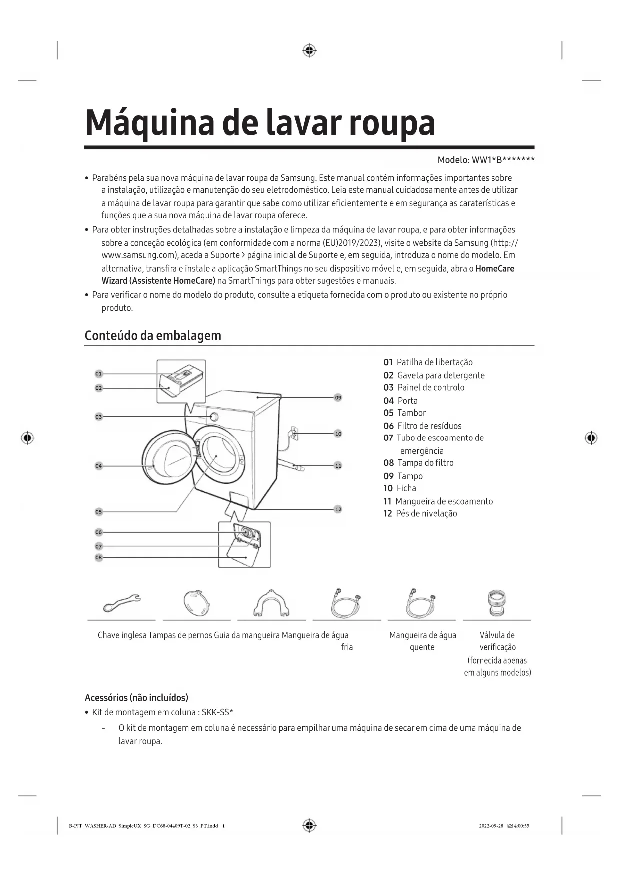 - Kit de montagem em coluna : SKK-SS* ‐ O kit de montagem em coluna é necessário para empilhar uma máquina de secar em cima de uma máquina de lavar roupa. B-PJT_WASHER-AD_SimpleUX_SG_DC68-04409T-02_S3_PT.indd 1 2022-09-28 4:00:55Português2 Informações de segurança NOTA