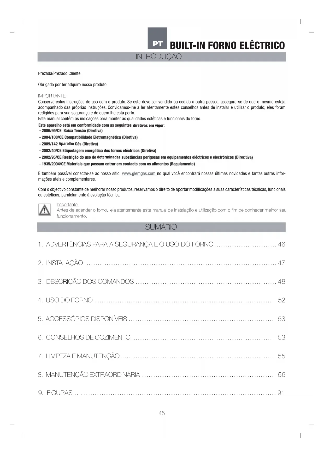 NOTES FR45 Prezada/Prezado Cliente, Obrigado por ter adquiro nosso produto. IMPORTANTE: Conserve estas instruções de uso com o produto. Se este deve ser vendido ou cedido a outra pessoa, assegure-se de que o mesmo esteja acompanhado das próprias instruções. Convidamos-lhe a ler atentamente estes conselhos antes de instalar e utilizar o produto; eles foram redigidos para sua segurança e de quem lhe está perto. Este manual contém as indicações para manter as qualidades estéticas e funcionais do forno. É também possível conectar-se ao nosso sítio: www.glemgas.com no qual você encontrará nossas últimas novidades e tantas outras infor- mações úteis e complementares. Com o objectivo constante de melhorar nosso produtos, reservamos o direito de aportar modificações a suas características técnicas, funcionais ou estéticas, paralelamente à evolução técnica.