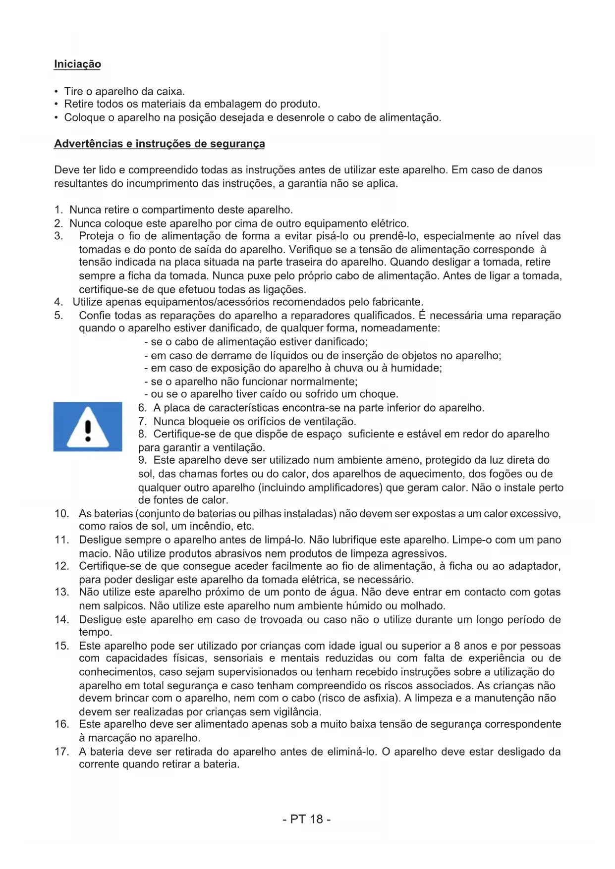 Deve ter lido e compreendido todas as instruções antes de utilizesir este aparelho. Em caso de danos resultantes do incumprimento das instruções, a garantia não se aplica.