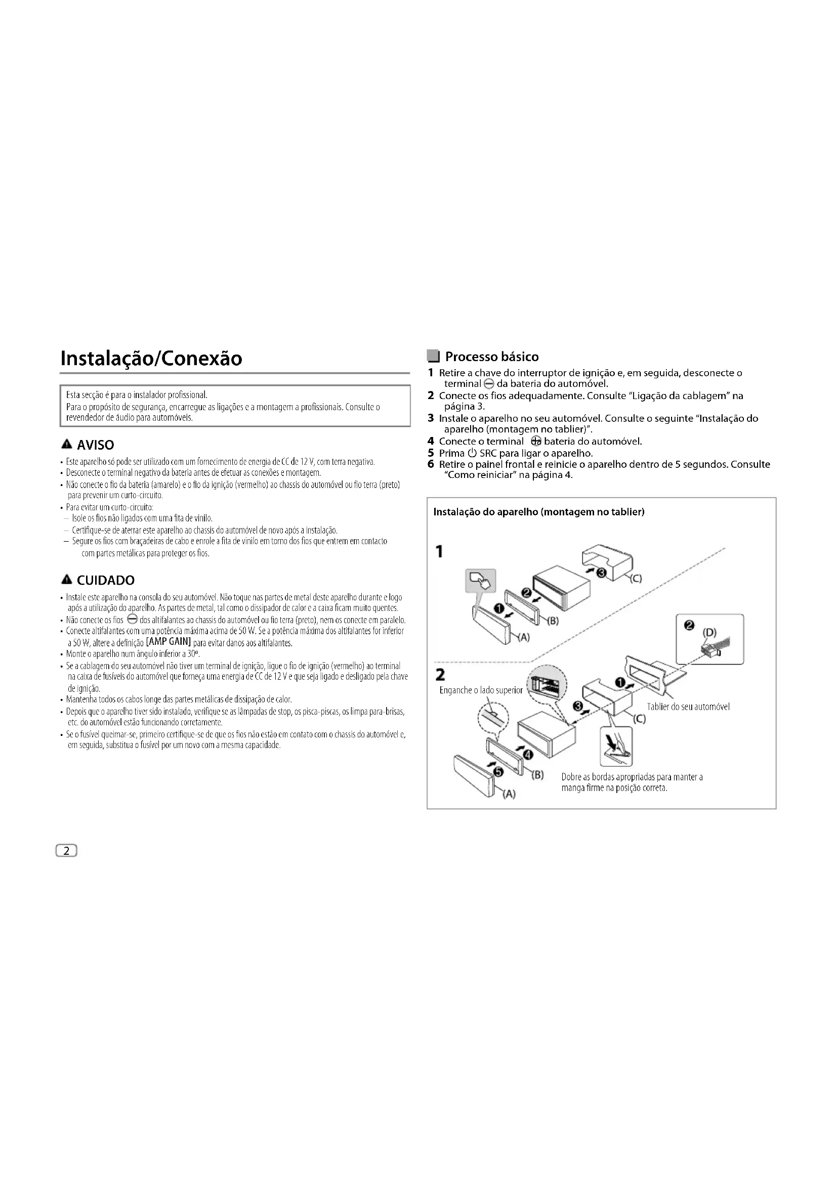 KD-X382BT_E_B5K-0867-00_NL.indd 7KD-X382BT_E_B5K-0867-00_NL.indd 7 2022/04/01 19:36:242022/04/01 19:36:242 Data Size: B6L (182 mm x 128 mm)Book Size: B6L (182 mm x 128 mm) Processo básico 1 Retire a chave do interruptor de ignição e, em seguida, desconecte o terminal da bateria do automóvel. 2 Conecte os fios adequadamente. Consulte “Ligação da cablagem” na página 3. 3 Instale o aparelho no seu automóvel. Consulte o seguinte “Instalação do aparelho (montagem no tablier)”. 4 Conecte o terminal da bateria do automóvel. 5 Prima B SRC para ligar o aparelho. 6 Retire o painel frontal e reinicie o aparelho dentro de 5 segundos. Consulte “Como reiniciar” na página 4. Instalação do aparelho (montagem no tablier) Instalação/Conexão Esta secção é para o instalador profissional. Para o propósito de segurança, encarregue as ligações e a montagem a profissionais. Consulte o revendedor de áudio para automóveis. AVISO