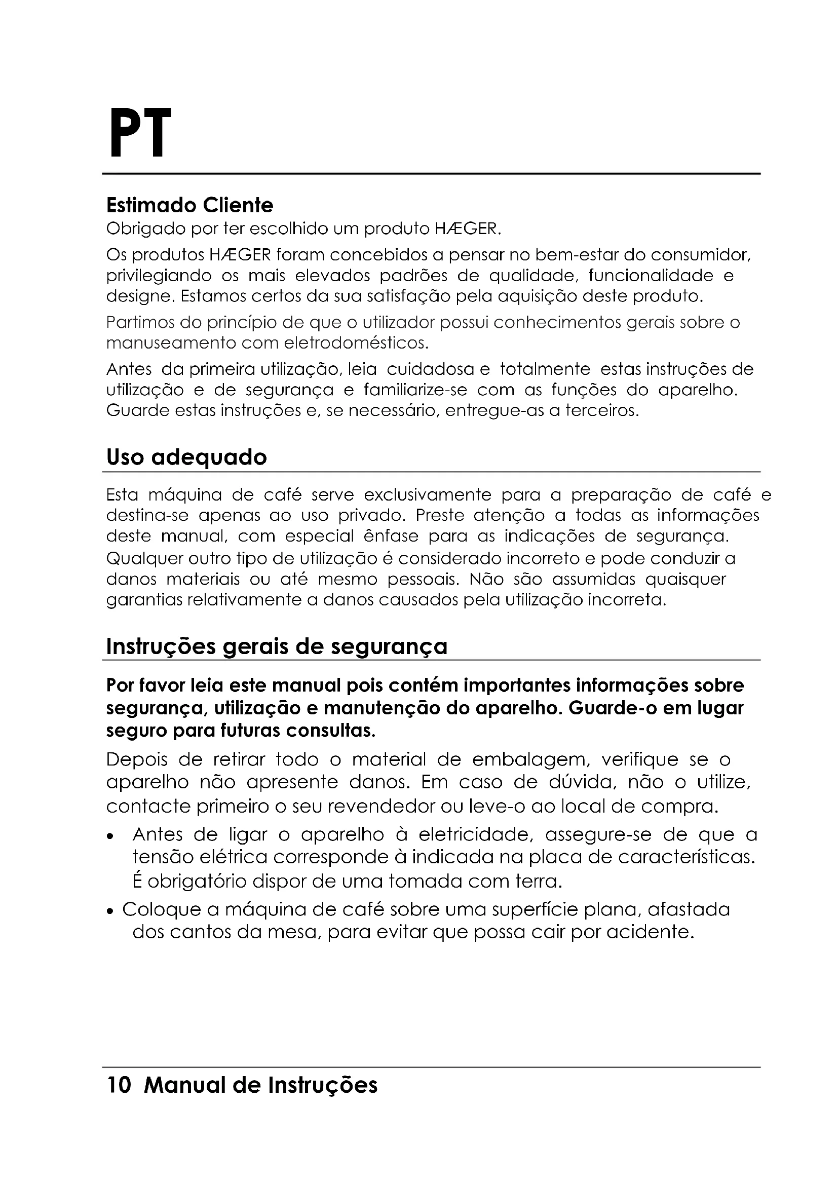 neither be excluded, nor restricted by this independent manufacturer’s declaration. The user is protected by the guarantee indicated in the Directive 1999/44/CE issue by the European Parliament on 1999, May 25. (*) Only for European Union countriesPT 10 Manual de Instruções Estimado Cliente Obrigado por ter escolhido um produto HÆGER. Os produtos HÆGER foram concebidos a pensar no bem-estar do consumidor, privilegiando os mais elevados padrões de qualidade, funcionalidade e designe. Estamos certos da sua satisfação pela aquisição deste produto. Partimos do princípio de que o utilizador possui conhecimentos gerais sobre o manuseamento com eletrodomésticos. Antes da primeira utilização, leia cuidadosa e totalmente estas instruções de utilização e de segurança e familiarize-se com as funções do aparelho. Guarde estas instruções e, se necessário, entregue-as a terceiros. Uso adequado Esta máquina de café serve exclusivamente para a preparação de café e destina-se apenas ao uso privado. Preste atenção a todas as informações deste manual, com especial ênfase para as indicações de segurança. Qualquer outro tipo de utilização é considerado incorreto e pode conduzir a danos materiais ou até mesmo pessoais. Não são assumidas quaisquer garantias relativamente a danos causados pela utilização incorreta. Instruções gerais de segurança Por favor leia este manual pois contém importantes informações sobre segurança, utilização e manutenção do aparelho. Guarde-o em lugar seguro para futuras consultas. Depois de retirar todo o material de embalagem, verifique se o aparelho não apresente danos. Em caso de dúvida, não o utilize, contacte primeiro o seu revendedor ou leve-o ao local de compra.