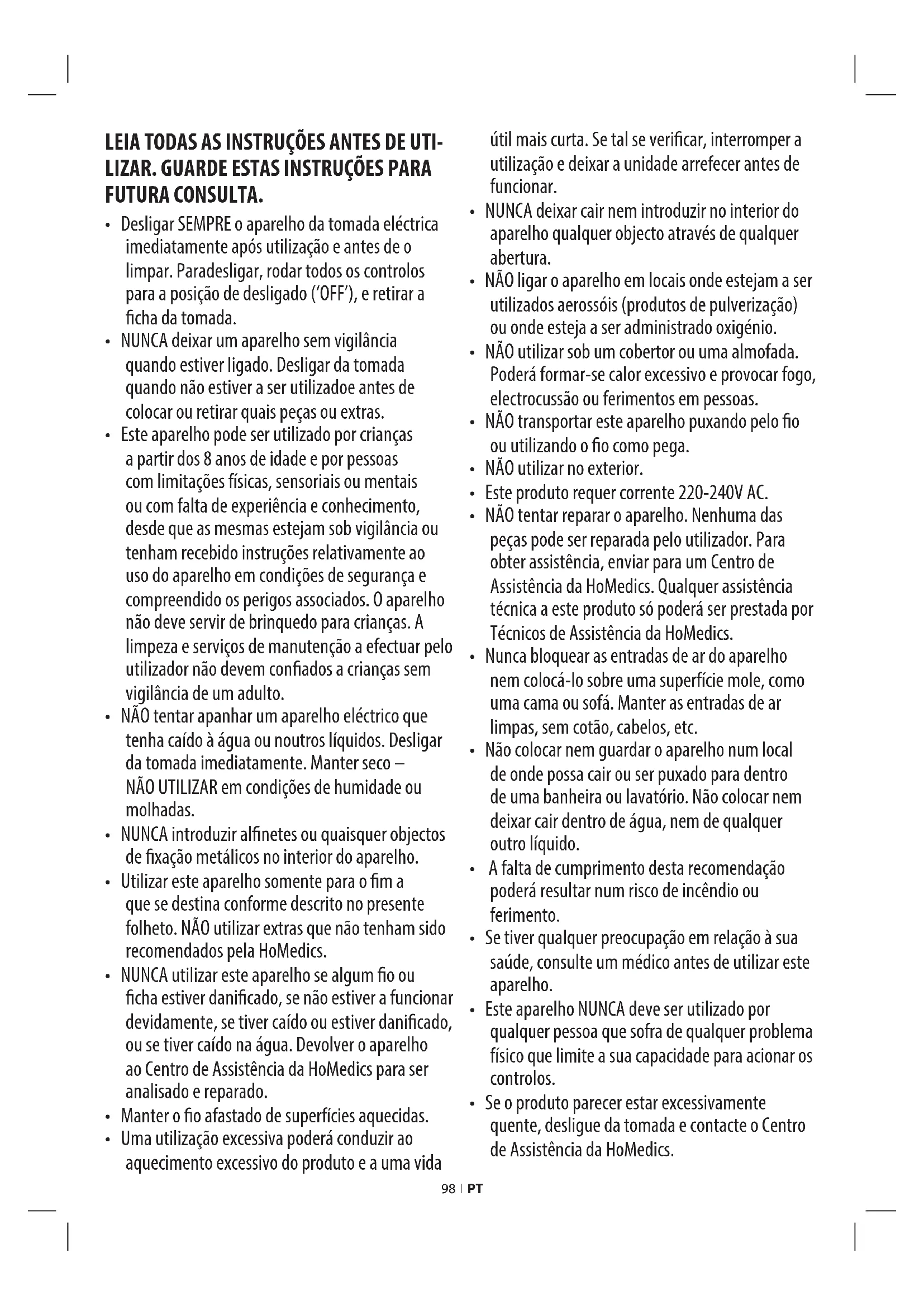 - Se o produto parecer estar excessivamente quente, desligue da tomada e contacte o Centro de Assistência da HoMedics.PT I 99
