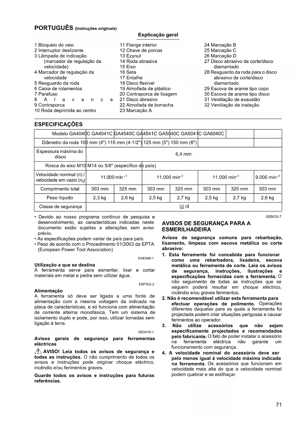 Tomoyasu Kato Director Makita Corporation 3-11-8, Sumiyoshi-cho, Anjo, Aichi, 446-8502, JAPAN71 PORTUGUÊS (Instruções originais) Explicação geral 1 Bloqueio do veio 2 Interruptor deslizante 3 Lâmpada de indicação (marcador de regulação da velocidade) 4 Marcador de regulação da velocidade 5 Resguardo da roda 6 Caixa de rolamentos 7 Parafuso 8Alavanca 9 Contraporca 10 Roda deprimida ao centro 11 Flange interior 12 Chave de porcas 13 Ezynut 14 Roda abrasiva 15 Eixo 16 Seta 17 Entalhe 18 Disco flexível 19 Almofada de plástico 20 Contraporca de lixagem 21 Disco abrasivo 22 Almofada de borracha 23 Marcação A 24 Marcação B 25 Marcação C 26 Marcação D 27 Disco abrasivo de corte/disco diamantado 28 Resguardo da roda para o disco abrasivo de corte/disco diamantado 29 Escova de arame tipo copo 30 Escova de arame tipo disco 31 Ventilação de exaustão 32 Ventilação de inalação ESPECIFICAÇÕES