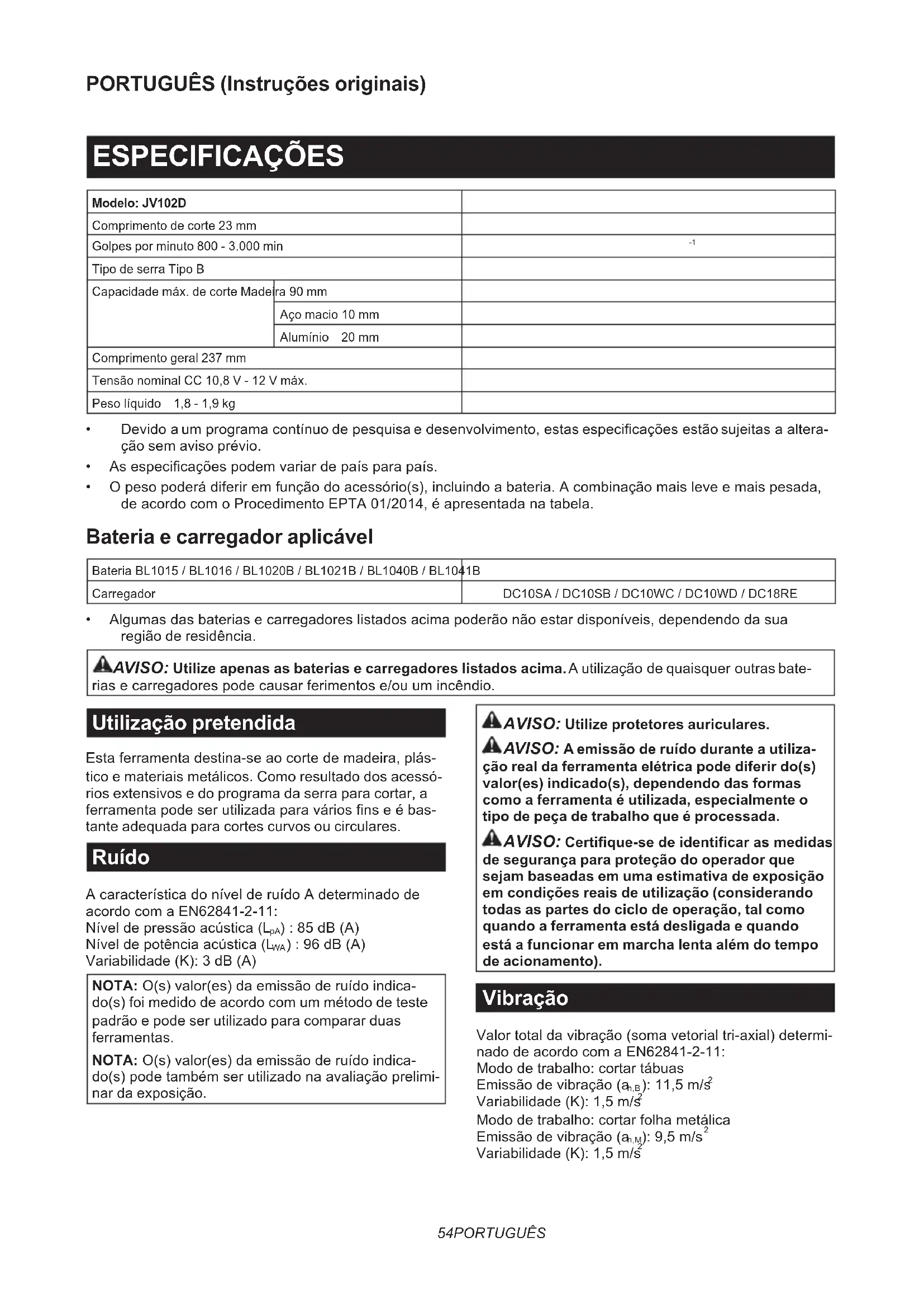 - Algumasdasbateriasecarregadoreslistadosacimapoderãonãoestardisponíveis,dependendodasua região de residência. AVISO: Utilize apenas as baterias e carregadores listados acima.Autilizaçãodequaisqueroutrasbate- riasecarregadorespodecausarferimentose/ouumincêndio. Utilização pretendida Estaferramentadestina-seaocortedemadeira,plás- tico e materiais metálicos. Como resultado dos acessó- rios extensivos e do programa da serra para cortar, a ferramentapodeserutilizadaparaváriosnseébas- tante adequada para cortes curvos ou circulares. Ruído AcaracterísticadonívelderuídoAdeterminadode acordocomaEN62841-2-11: Níveldepressãoacústica(L