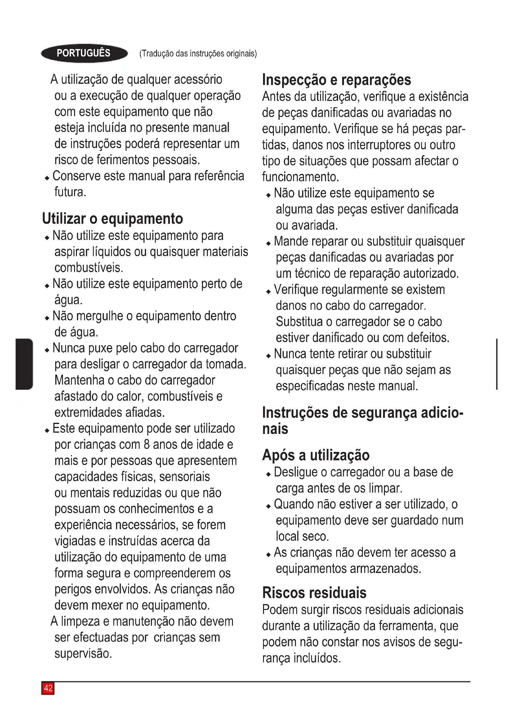 Atenção! Leia todos os avisos de segurança e todas as instruções. O não cumprimento dos seguintes avisos e instruções pode resultar em choque elétrico, incêndioe/ouferimentosgraves. u A utilização prevista está descrita neste manual.42 (Tradução das instruções originais) PORTUGUÊS A utilização de qualquer acessório ou a execução de qualquer operação com este equipamento que não esteja incluída no presente manual de instruções poderá representar um risco de ferimentos pessoais. u Conserve este manual para referência futura. Utilizar o equipamento u Não utilize este equipamento para aspirar líquidos ou quaisquer materiais combustíveis. u Não utilize este equipamento perto de água. u Não mergulhe o equipamento dentro de água. u Nunca puxe pelo cabo do carregador para desligar o carregador da tomada. Mantenha o cabo do carregador afastado do calor, combustíveis e extremidadesaadas. u Este equipamento pode ser utilizado por crianças com 8 anos de idade e mais e por pessoas que apresentem capacidades físicas, sensoriais ou mentais reduzidas ou que não possuam os conhecimentos e a experiência necessários, se forem vigiadas e instruídas acerca da utilização do equipamento de uma forma segura e compreenderem os perigos envolvidos. As crianças não devem mexer no equipamento. A limpeza e manutenção não devem ser efectuadas por crianças sem supervisão. Inspecção e reparações Antesdautilização,veriqueaexistência depeçasdanicadasouavariadasno equipamento.Veriquesehápeçaspar- tidas, danos nos interruptores ou outro tipo de situações que possam afectar o funcionamento. u Não utilize este equipamento se algumadaspeçasestiverdanicada ou avariada. u Mande reparar ou substituir quaisquer peçasdanicadasouavariadaspor um técnico de reparação autorizado. u Veriqueregularmenteseexistem danos no cabo do carregador. Substitua o carregador se o cabo estiverdanicadooucomdefeitos. u Nunca tente retirar ou substituir quaisquer peças que não sejam as especicadasnestemanual. Instruções de segurança adicio- nais Após a utilização u Desligue o carregador ou a base de carga antes de os limpar. u Quando não estiver a ser utilizado, o equipamento deve ser guardado num local seco. u As crianças não devem ter acesso a equipamentos armazenados. Riscos residuais Podem surgir riscos residuais adicionais durante a utilização da ferramenta, que podem não constar nos avisos de segu- rança incluídos.43 (Tradução das instruções originais)PORTUGUÊS Estes riscos podem resultar de má uti- lização, uso prolongado, etc. Mesmo com o cumprimento dos reg- ulamentos de segurança relevantes e a implementação de dispositivos de segurança, alguns riscos residuais não podem ser evitados. Estes incluem: u Ferimentos causados pelo contacto compeçasemrotação/movimento. u Ferimentos causados durante a substituição de peças, lâminas ou acessórios. u Ferimentos causados pela utilização prolongada de uma ferramenta. Se utilizar uma ferramenta durante períodosprolongados,certique-sede que faz pausas regularmente. u Danos auditivos.u Problemas de saúde causados pela inalação de poeiras resultantes da utilização da ferramenta (exemplo: trabalhos em madeira, especialmente carvalho, faia e MDF). Carregadores O carregador foi concebido para uma tensãoespecíca.Veriquesemprese a tensão de alimentação corresponde à tensão indicada na placa sinaléctica. Atenção! Nunca tente substituir a uni- dade do carregador por uma tomada de alimentação normal. u Utilize o carregador BLACK+DECKER apenas para carregar a bateria do equipamento com que foi fornecido. Outras baterias podem rebentar, provocando ferimentos e danos. u Nunca tente carregar baterias não recarregáveis. u Se o cabo de alimentação estiver danicado,devesersubstituído pelo fabricante ou por um centro de assistência autorizado da BLACK+DECKER, para evitar situações de perigo. u Não exponha o carregador à água.u Não abra o carregador.u Não perfure o carregador.u Oequipamento/bateriadeveser colocado numa área com boa ventilação durante o carregamento. Segurança eléctrica Símbolos no carregador Leia atentamente o manual completo antes de utilizar este equipamento. Esta ferramenta tem isolamento duplo. Por esse motivo,nãonecessitadeligaçãoàterra.Veriquesempre se a tensão da tomada de electricidade corresponde à tensão indicada na placa com os requisitos de alimentação da ferramenta. A base de carga destina-se exclusivamente a uma utilização no interior.Etiquetas no equipamentoO equipamento apresenta os seguintes símbolos juntamente com o código de data Leia com atenção e na íntegra o manual antes de utilizar este equipamento S010Q 23 S010**2400040/ SSC-250040** As unidades BHFEV182B, BHFEV182C, BHFEV182CP utilizam o carregador S010**2400040/ SSC-250040**ComponentesEsta ferramenta inclui algumas ou todas as funcionalidades seguintes. 1.Botãoparaligar/desligar 2. Interruptor de alimentação de 3 velocidades44 (Tradução das instruções originais) PORTUGUÊS 2a. Botão de activação da escova rotativa