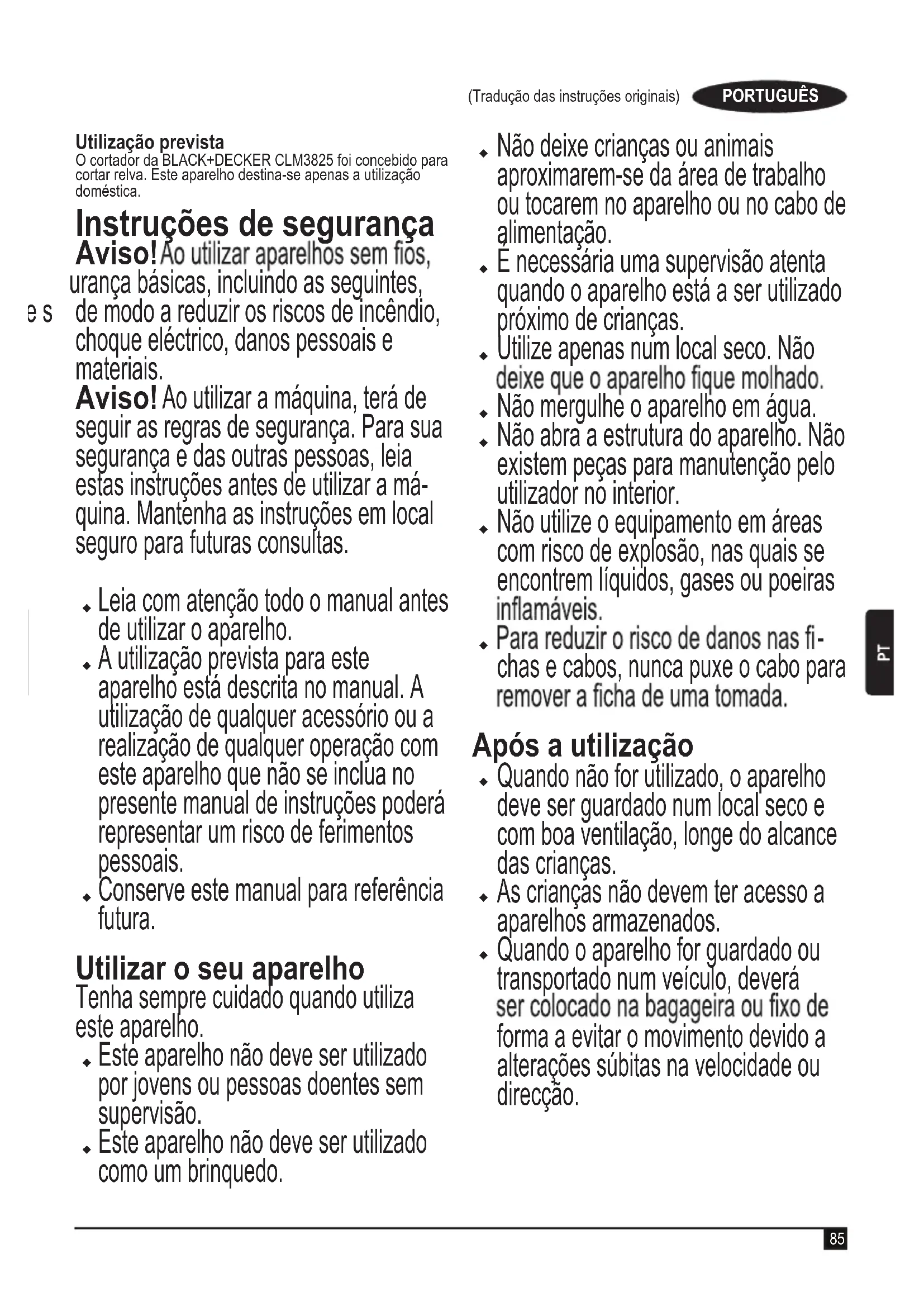 Quando o aparelho for guardado ou transportado num veículo, deverá forma a evitar o movimento devido a alterações súbitas na velocidade ou direcção. Utilização prevista O cortador da BLACK+DECKER CLM3825 foi concebido para cortar relva. Este aparelho destina-se apenas a utilização doméstica. Instruções de segurança Aviso! deve s urança básicas, incluindo as seguintes, de modo a reduzir os riscos de incêndio, choque eléctrico, danos pessoais e materiais. Aviso! Ao utilizar a máquina, terá de seguir as regras de segurança. Para sua segurança e das outras pessoas, leia estas instruções antes de utilizar a má- quina. Mantenha as instruções em local seguro para futuras consultas. (Tradução das instruções originais) PORTUGUÊS86 Inspecção e reparações