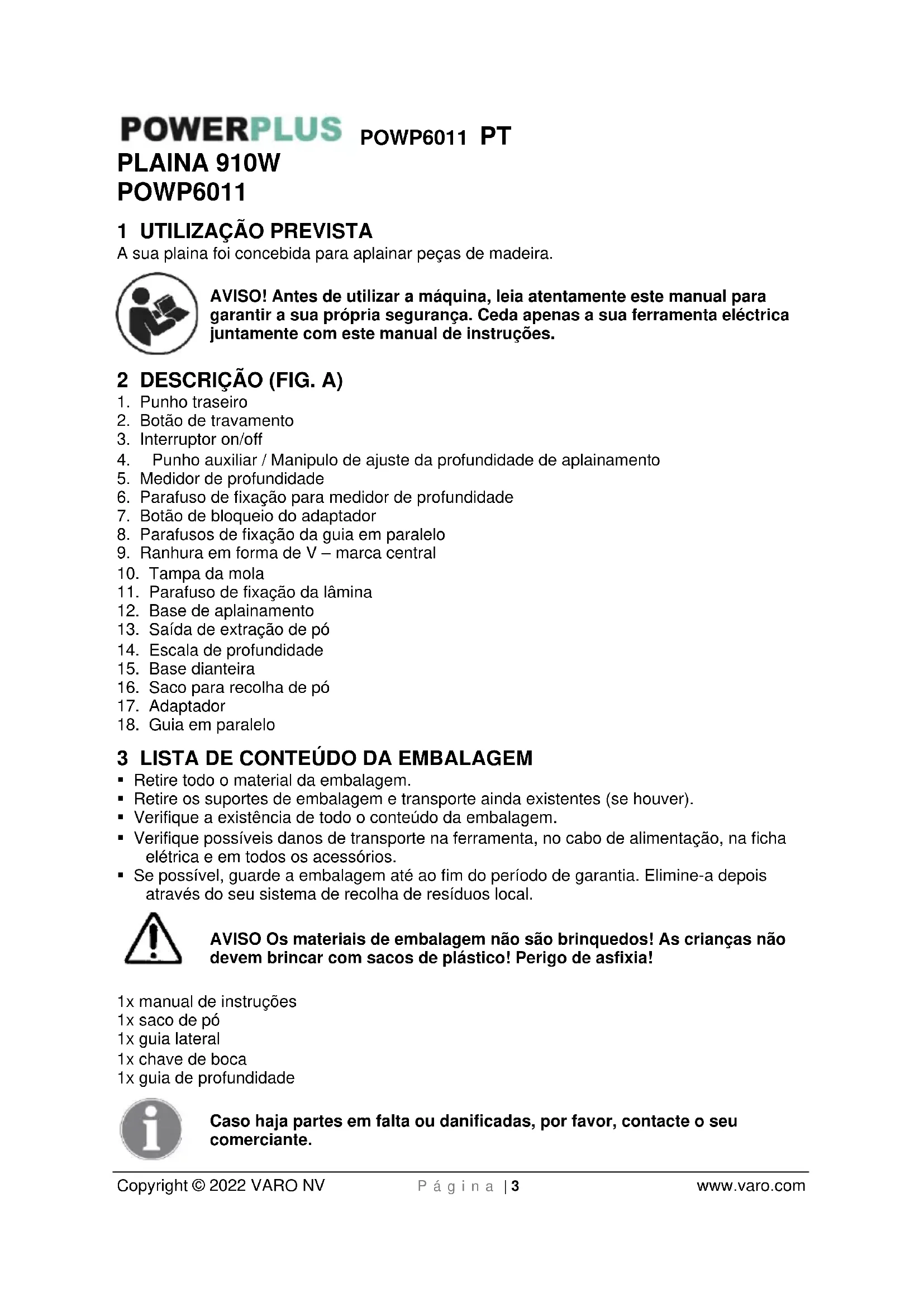 - Se possível, guarde a embalagem até ao fim do período de garantia. Elimine-a depois através do seu sistema de recolha de resíduos local. AVISO Os materiais de embalagem não são brinquedos! As crianças não devem brincar com sacos de plástico! Perigo de asfixia! 1x manual de instruções 1x saco de pó 1x guia lateral 1x chave de boca 1x guia de profundidade Caso haja partes em falta ou danificadas, por favor, contacte o seu comerciante.POWP6011 PT Copyright © 2022 VARO NV P á g i n a | 4 www.varo.com 4 SÍMBOLOS Neste manual e/ou na máquina são utilizados os seguintes símbolos: