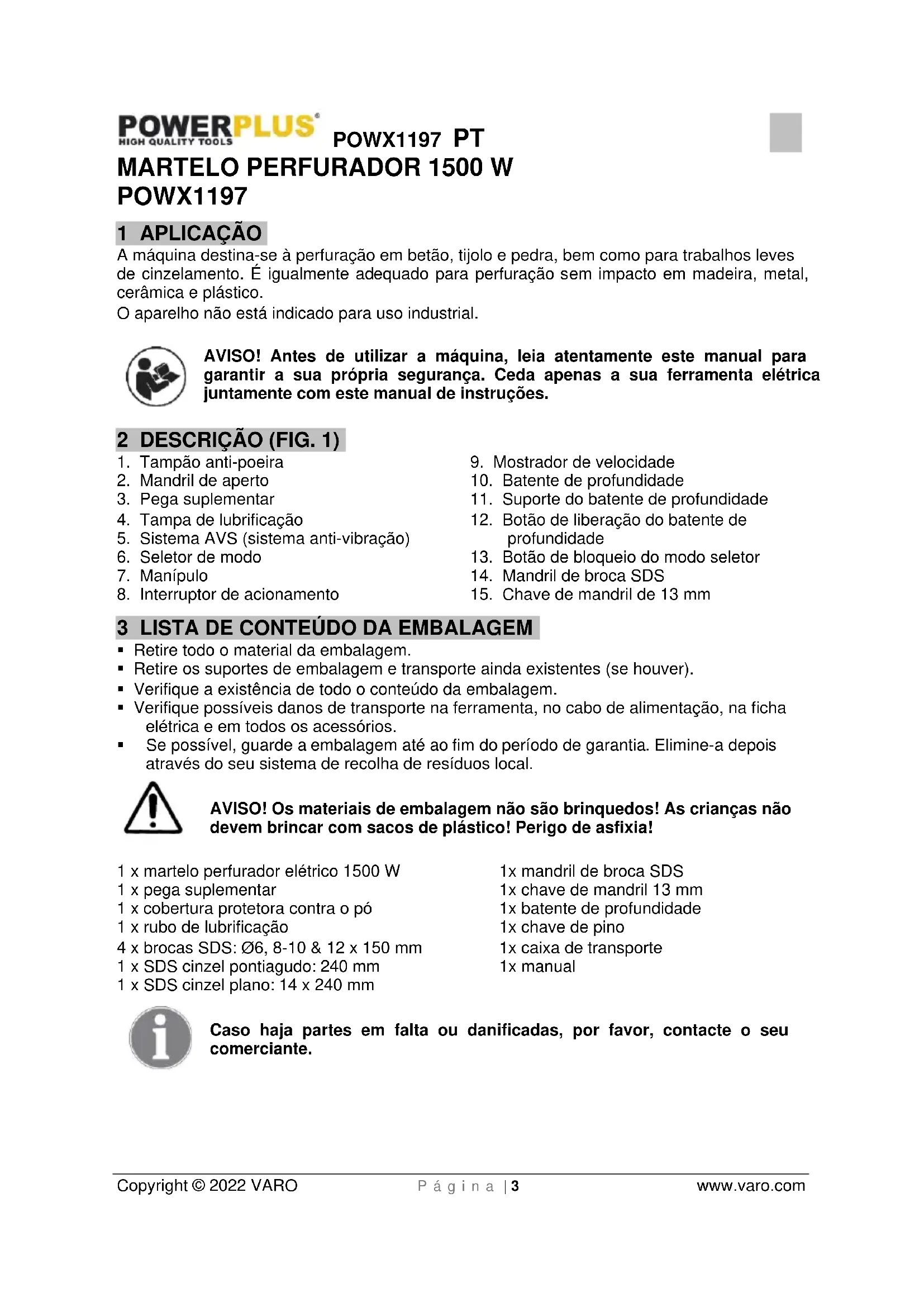 AVISO! Antes de utiliser a boaquina, leia atentamente este manual para garantir a sua和个人a segurarca. Ceda apenas a sua ferramenta eletrica jintamente com estemanual de instruções.