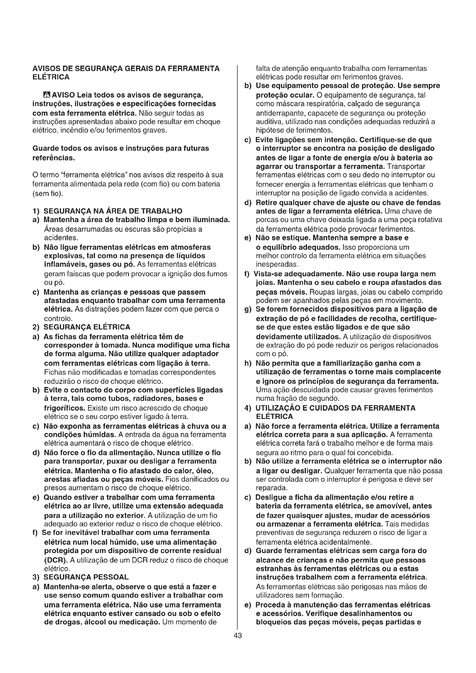 ELÉTRICA a) Não force a ferramenta elétrica. Utilize a ferramenta elétrica correta para a sua aplicação. A ferramenta elétrica correta fará o trabalho melhor e de forma mais segura ao ritmo para o qual foi concebida. b) Não utilize a ferramenta elétrica se o interruptor não a ligar ou desligar. Qualquer ferramenta que não possa ser controlada com o interruptor é perigosa e deve ser reparada. c) Desligue a cha da alimentação e/ou retire a bateria da ferramenta elétrica, se amovível, antes de fazer quaisquer ajustes, mudar de acessórios ou armazenar a ferramenta elétrica. Tais medidas preventivas de segurança reduzem o risco de ligar a ferramenta elétrica acidentalmente. d) Guarde ferramentas elétricas sem carga fora do alcance de crianças e não permita que pessoas estranhas às ferramentas elétricas ou a estas instruções trabalhem com a ferramenta elétrica. As ferramentas elétricas são perigosas nas mãos de utilizadores sem formação. e) Proceda à manutenção das ferramentas elétricas e acessórios. Verique desalinhamentos ou bloqueios das peças móveis, peças partidas e AVISOS DE SEGURANÇA GERAIS DA FERRAMENTA ELÉTRICA - AVISO Leia todos os avisos de segurança, instruções, ilustrações e especicações fornecidas com esta ferramenta elétrica. Não seguir todas as instruções apresentadas abaixo pode resultar em choque elétrico, incêndio e/ou ferimentos graves. Guarde todos os avisos e instruções para futuras referências. O termo “ferramenta elétrica” nos avisos diz respeito à sua ferramenta alimentada pela rede (com o) ou com bateria (sem o).