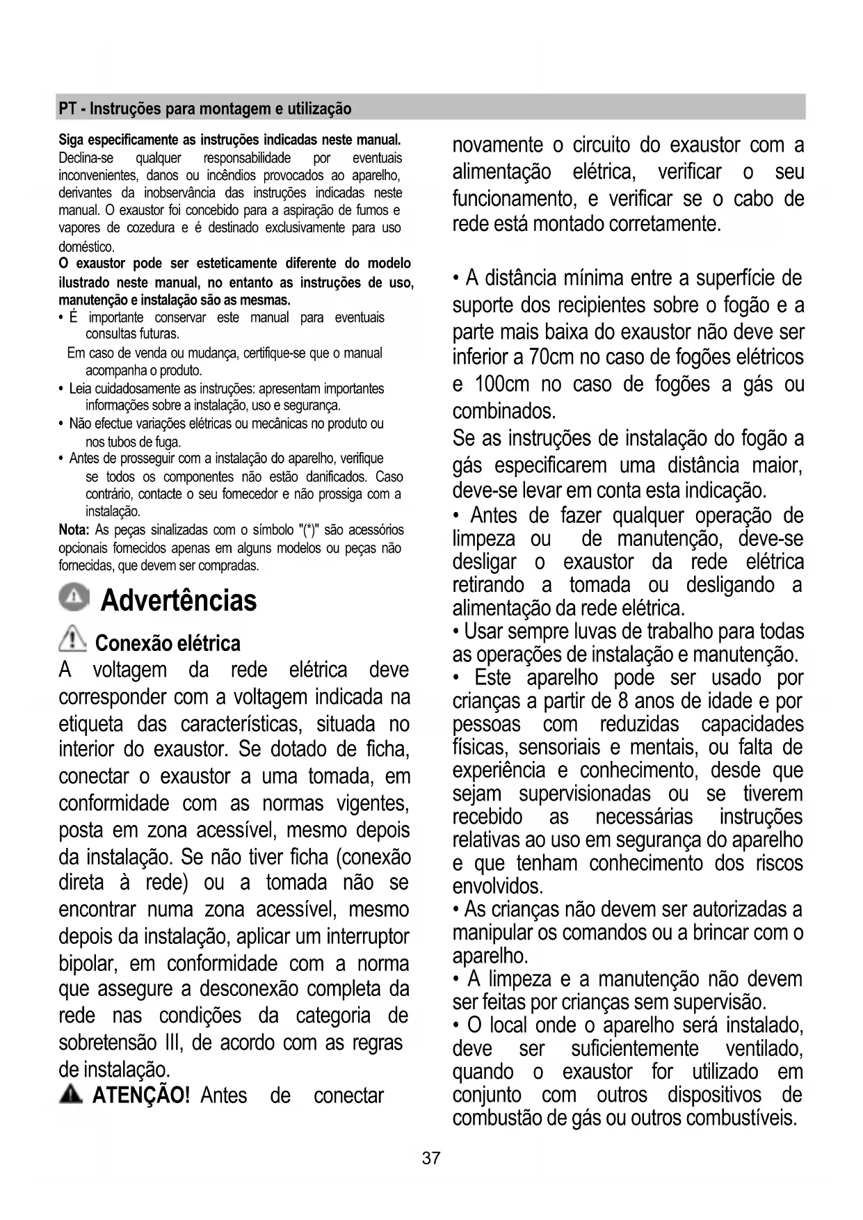 - Antes de prosseguir com a instalação do aparelho, verifique se todos os componentes não estão danificados. Caso contrário, contacte o seu fornecedor e não prossiga com a instalação. Nota: As peças sinalizadas com o símbolo "(*)" são acessórios opcionais fornecidos apenas em alguns modelos ou peças não fornecidas, que devem ser compradas. Advertências Conexão elétrica A voltagem da rede elétrica deve corresponder com a voltagem indicada na etiqueta das características, situada no interior do exaustor. Se dotado de ficha, conectar o exaustor a uma tomada, em conformidade com as normas vigentes, posta em zona acessível, mesmo depois da instalação. Se não tiver ficha (conexão direta à rede) ou a tomada não se encontrar numa zona acessível, mesmo depois da instalação, aplicar um interruptor bipolar, em conformidade com a norma que assegure a desconexão completa da rede nas condições da categoria de sobretensão III, de acordo com as regras de instalação. ATENÇÃO! Antes de conectar novamente o circuito do exaustor com a alimentação elétrica, verificar o seu funcionamento, e verificar se o cabo de rede está montado corretamente.