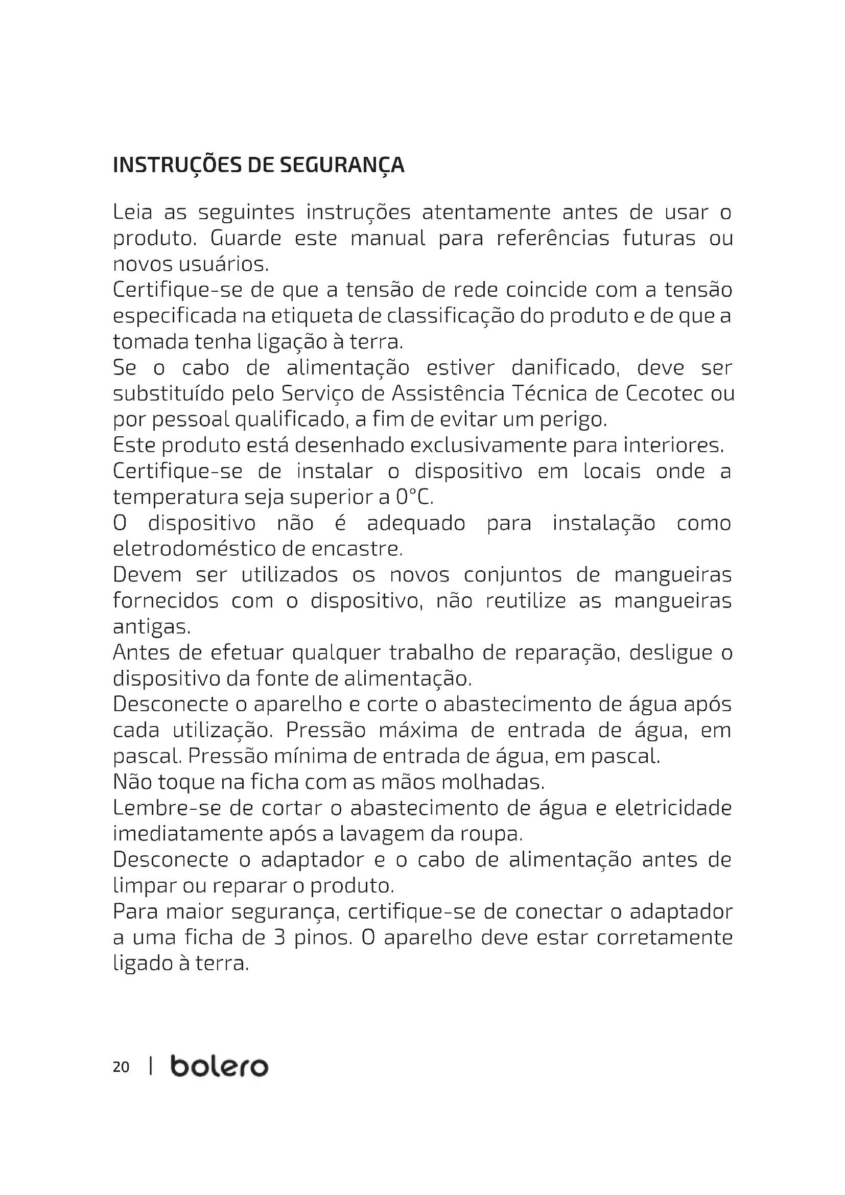 Leia as seguintes instruções atentamente antes de usar o produto. Guarde este manual para referências futuras ou novos usuários. Certifique-se de que a tensão de rede coincide com a tensão especificada na etiqueta de classificação do produto e de que a tomada tenha ligação à terra. Se o cabo de alimentação estiver danificado, deve ser substituído pelo Serviço de Assistência Técnica de Cecotec ou por pessoal qualificado, a fim de evitar um perigo. Este produto está desenhado exclusivamente para interiores. Certifique-se de instalar o dispositivo em locais onde a temperatura seja superior a 0°C. O dispositivo não é adequado para instalação como eletrodoméstico de encastre. Devem ser utilizados os novos conjuntos de mangueiras fornecidos com o dispositivo, não reutilize as mangueiras antigas. Antes de efetuar qualquer trabalho de reparação, desligue o dispositivo da fonte de alimentação. Desconecte o aparelho e corte o abastecimento de água após cada utilização. Pressão máxima de entrada de água, em pascal. Pressão mínima de entrada de água, em pascal. Não toque na ficha com as mãos molhadas. Lembre-se de cortar o abastecimento de água e eletricidade imediatamente após a lavagem da roupa. Desconecte o adaptador e o cabo de alimentação antes de limpar ou reparar o produto. Para maior segurança, certifique-se de conectar o adaptador a uma ficha de 3 pinos. O aparelho deve estar corretamente ligado à terra. IM 02317 02322 02327 02332 02319 02324 02328 02333 Lavadora Bolero DressCode_IC_YV_02210311.indd 20IM 02317 02322 02327 02332 02319 02324 02328 02333 Lavadora Bolero DressCode_IC_YV_02210311.indd 20 11/3/21 17:2411/3/21 17:2421 DRESSCODE 7200 / 8200 / 9200 / 10200 INVERTER