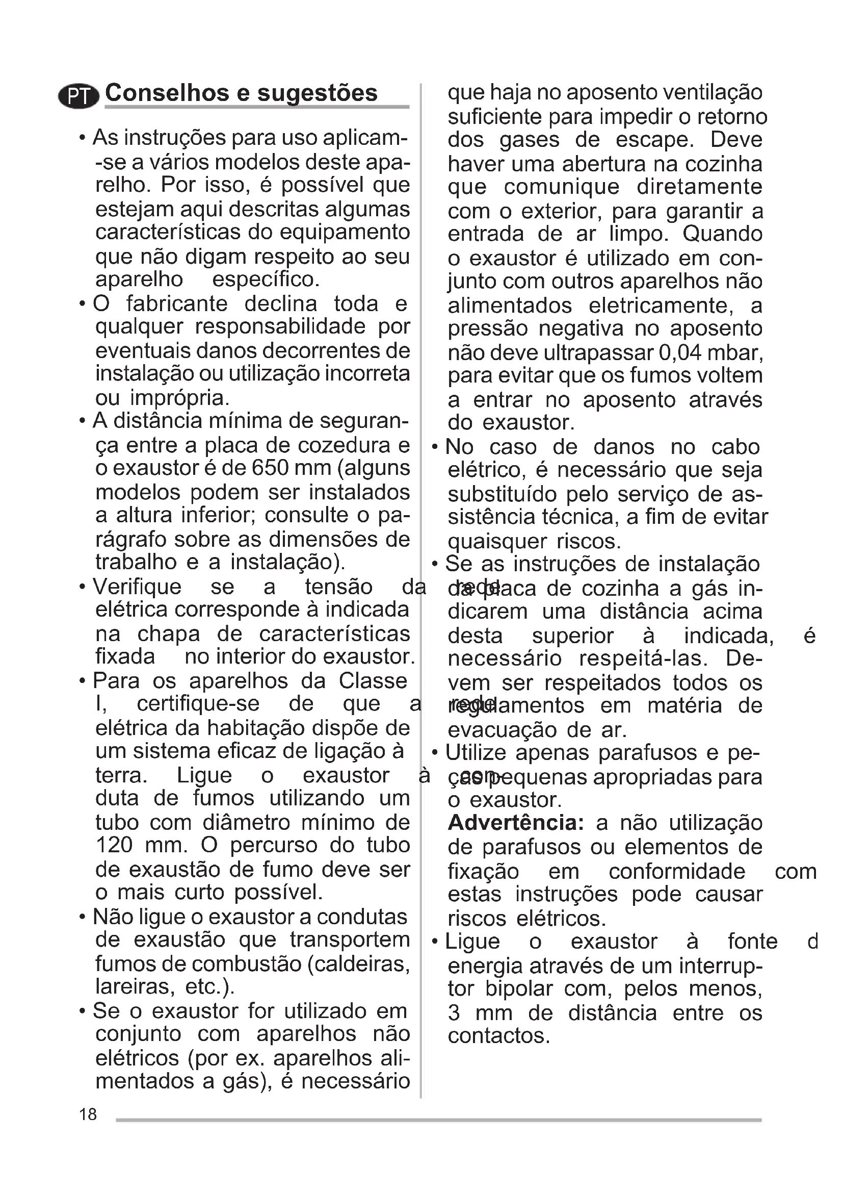 - Ligue o exaustor à fonte de energia através de um interrup- tor bipolar com, pelos menos, 3 mm de distância entre os contactos. PT19 Uso