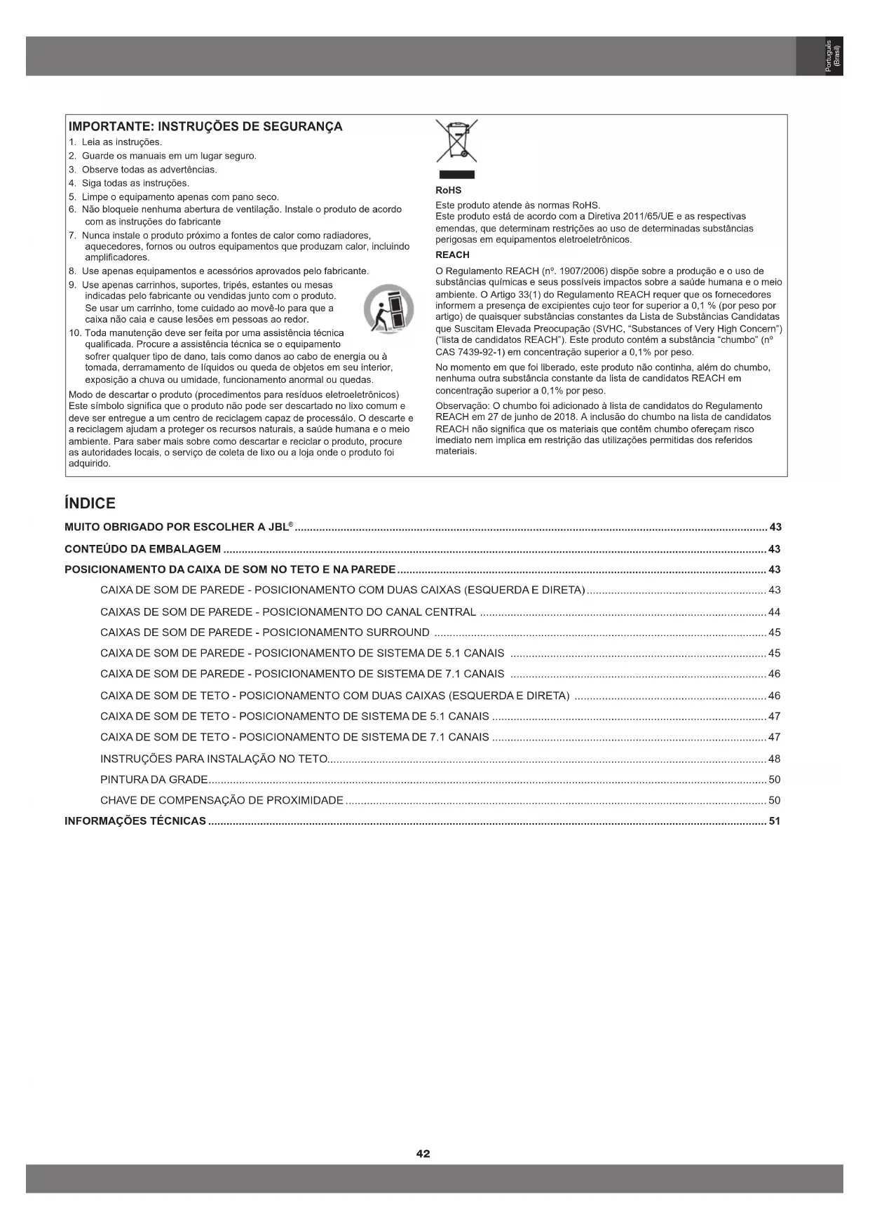 qualicada. Procure a assistência técnica se o equipamento sofrer qualquer tipo de dano, tais como danos ao cabo de energia ou à tomada, derramamento de líquidos ou queda de objetos em seu interior, exposição a chuva ou umidade, funcionamento anormal ou quedas. Modo de descartar o produto (procedimentos para resíduos eletroeletrônicos) Este símbolo signica que o produto não pode ser descartado no lixo comum e deve ser entregue a um centro de reciclagem capaz de processálo. O descarte e a reciclagem ajudam a proteger os recursos naturais, a saúde humana e o meio ambiente. Para saber mais sobre como descartar e reciclar o produto, procure as autoridades locais, o serviço de coleta de lixo ou a loja onde o produto foi adquirido. RoHS Este produto atende às normas RoHS. Este produto está de acordo com a Diretiva 2011/65/UE e as respectivas emendas, que determinam restrições ao uso de determinadas substâncias perigosas em equipamentos eletroeletrônicos. REACH O Regulamento REACH (nº. 1907/2006) dispõe sobre a produção e o uso de substâncias químicas e seus possíveis impactos sobre a saúde humana e o meio ambiente. O Artigo 33(1) do Regulamento REACH requer que os fornecedores informem a presença de excipientes cujo teor for superior a 0,1 % (por peso por artigo) de quaisquer substâncias constantes da Lista de Substâncias Candidatas que Suscitam Elevada Preocupação (SVHC, “Substances of Very High Concern”) (“lista de candidatos REACH”). Este produto contém a substância “chumbo” (nº CAS 7439-92-1) em concentração superior a 0,1% por peso. No momento em que foi liberado, este produto não continha, além do chumbo, nenhuma outra substância constante da lista de candidatos REACH em concentração superior a 0,1% por peso. Observação: O chumbo foi adicionado à lista de candidatos do Regulamento REACH em 27 de junho de 2018. A inclusão do chumbo na lista de candidatos REACH não signica que os materiais que contêm chumbo ofereçam risco imediato nem implica em restrição das utilizações permitidas dos referidos materiais. ÍNDICE